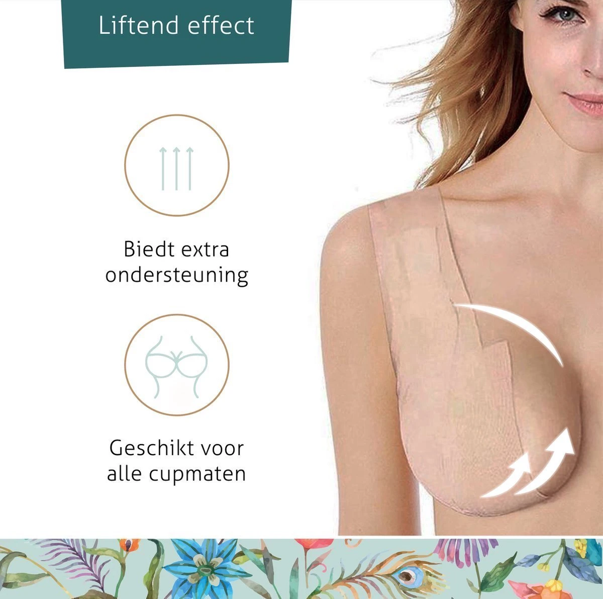 Doordat je de Boob Tape zo strak kunt doen als je wilt kan je ook je borsten ermee liften, dit werkt perfect onder een jurkje of shirt. Doordat er gebruik is gemaakt van elastaan en spandex is de Boob Tape tot wel 180% uit te rekken zodat het liften makkelijker wordt en aangenamer voelt. De Boob Tape biedt daarbuiten nog ondersteuning van de borsten voor een comfortabel en vrij gevoel. Het product knelt niet en belemmert niet in de omgang.