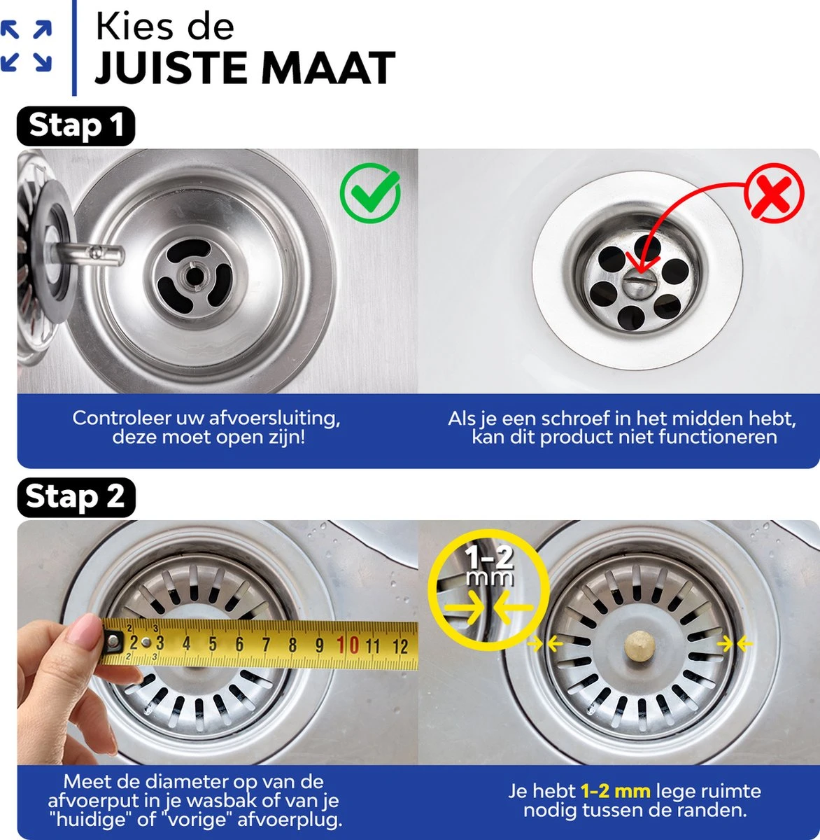 Meet de afvoerput in jouw wasbak nauwkeurig op of neem contact op met de leverancier om de juiste maat afvoerplug te kunnen kiezen. Volg de 4 stappen op onze afbeelding > Kies de juiste maat