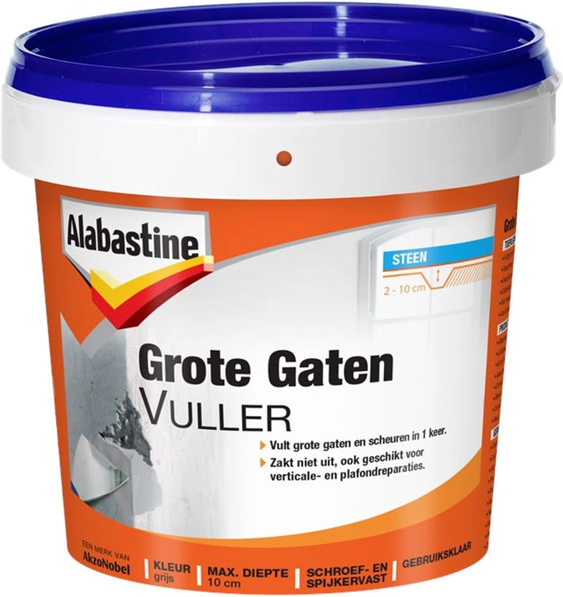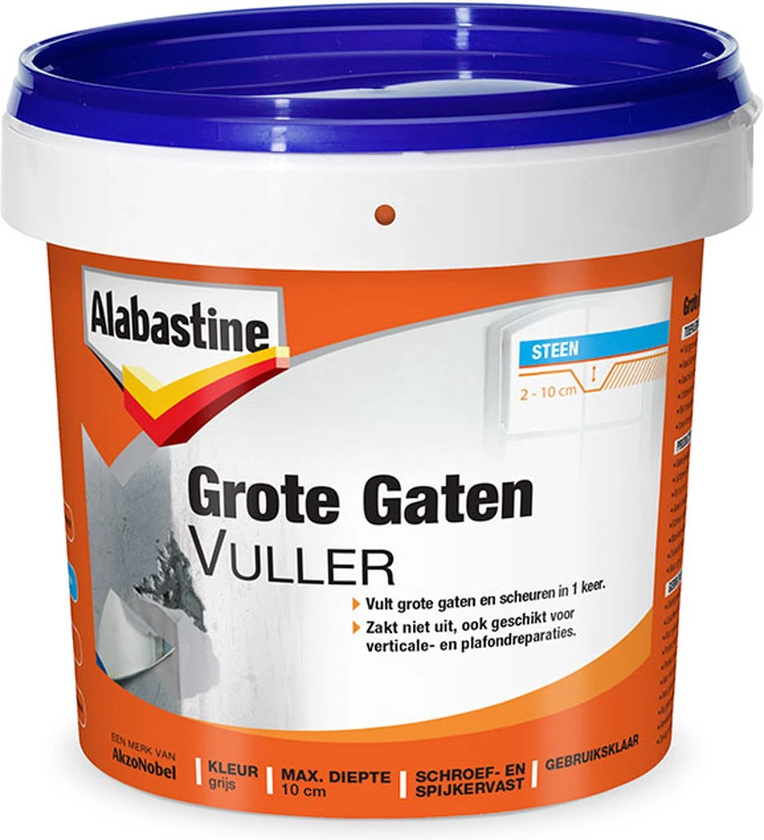 Alabastine grote gatenvuller is een ideaal product voor binnen buiten. Je vult er moeiteloos gaten mee tot wel 10 cm diep. Eenmaal aangebracht, zakt Alabastine grote gatenvuller niet uit. Zo ben je verzekerd van een goed eindresultaat.