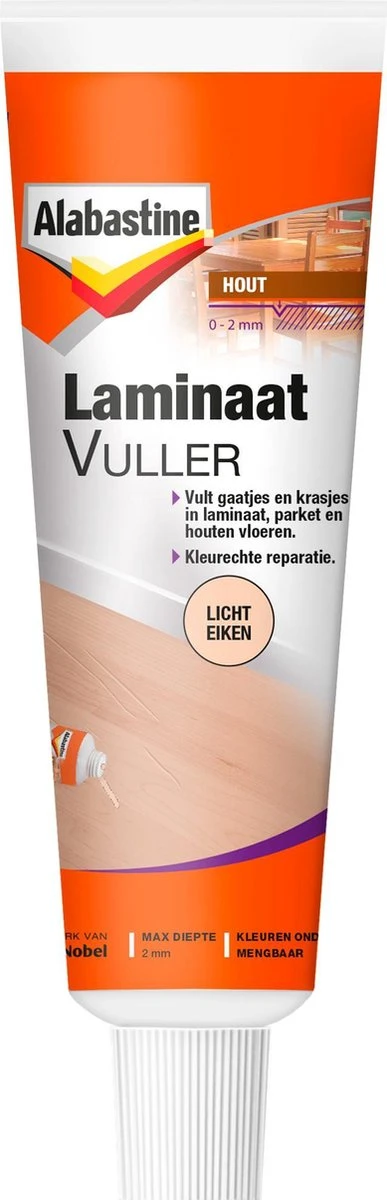 Als je gaatjes en krasjes in je laminaat hebt, wil je die zo onzichtbaar en kleurecht mogelijk vullen. Alabastine Laminaatvuller zorgt daarvoor. Dit product is verkrijgbaar in 6 kleuren die onderling mengbaar zijn. Zo krijg je altijd de perfecte kleur.