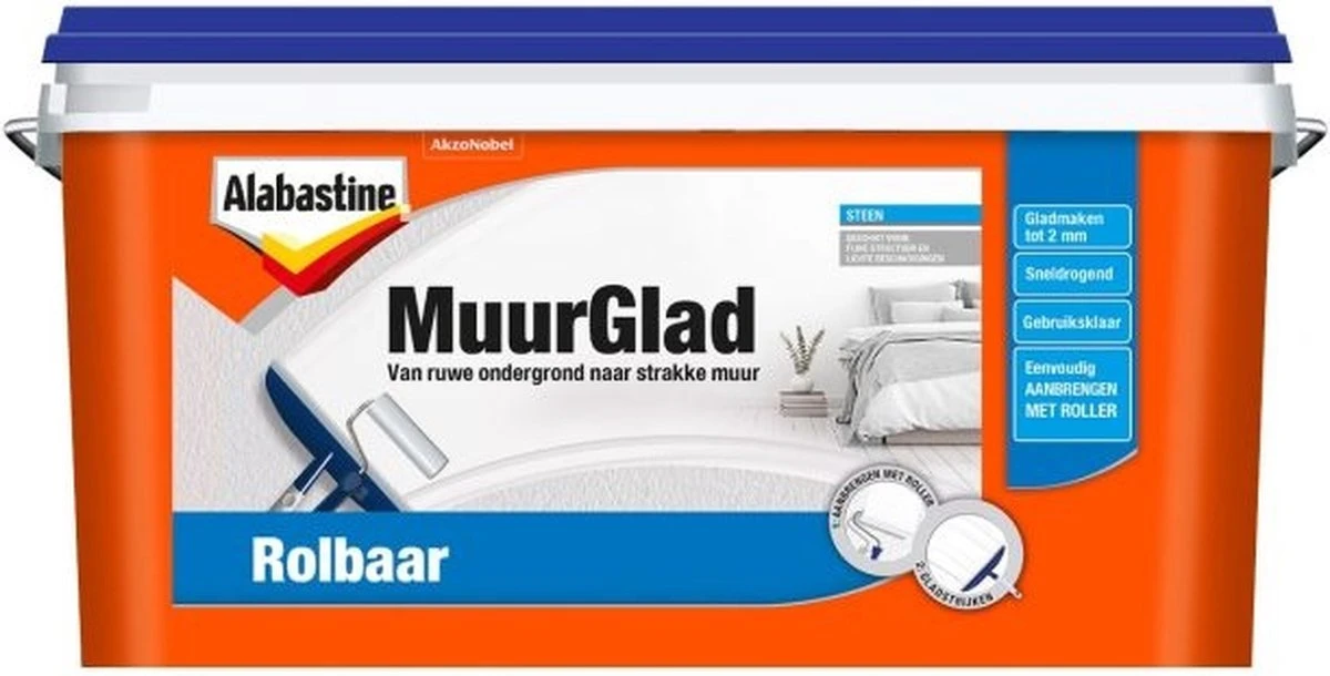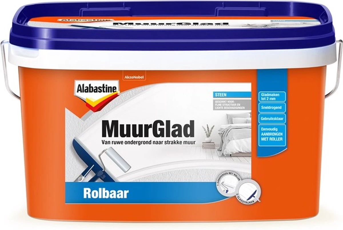 Alabastine muurglad kun je heel eenvoudig aanbrengen met de muurglad roller () en vervolgens glad afwerken met de muurglad strijker (). Egaliseren wordt er een stuk makkelijker door. Zo kun je snel een wat groter oppervlak perfect glad maken.