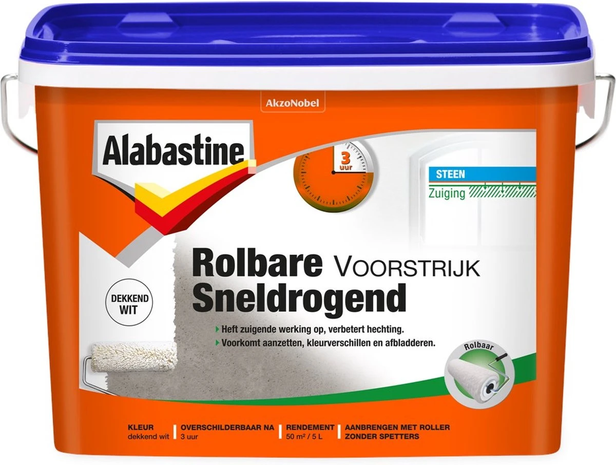 De Alabastine Rolbare Voorstrijk Dekkend Wit is een gepigmenteerde voorstrijk voor muren en plafonds en geeft een witte basislaag voor een betere dekking van de eindverf. Tevens is deze voorstrijk geschikt als grondverf voor muren met felle of donkere kleuren. Deze voorstrijk kan snel en schoon zonder spetters met een roller aangebracht worden en heeft een uitstekende hechting op steen, beton, stucwerk, spuitwerk (spack), gipsplaten en plaatmateriaal. De Alabastine Rolbare Voorstrijk Dekkend Wit is na 6 uur overschilderbaar met alle soorten muurverf en is verkrijgbaar is 5 liter.
