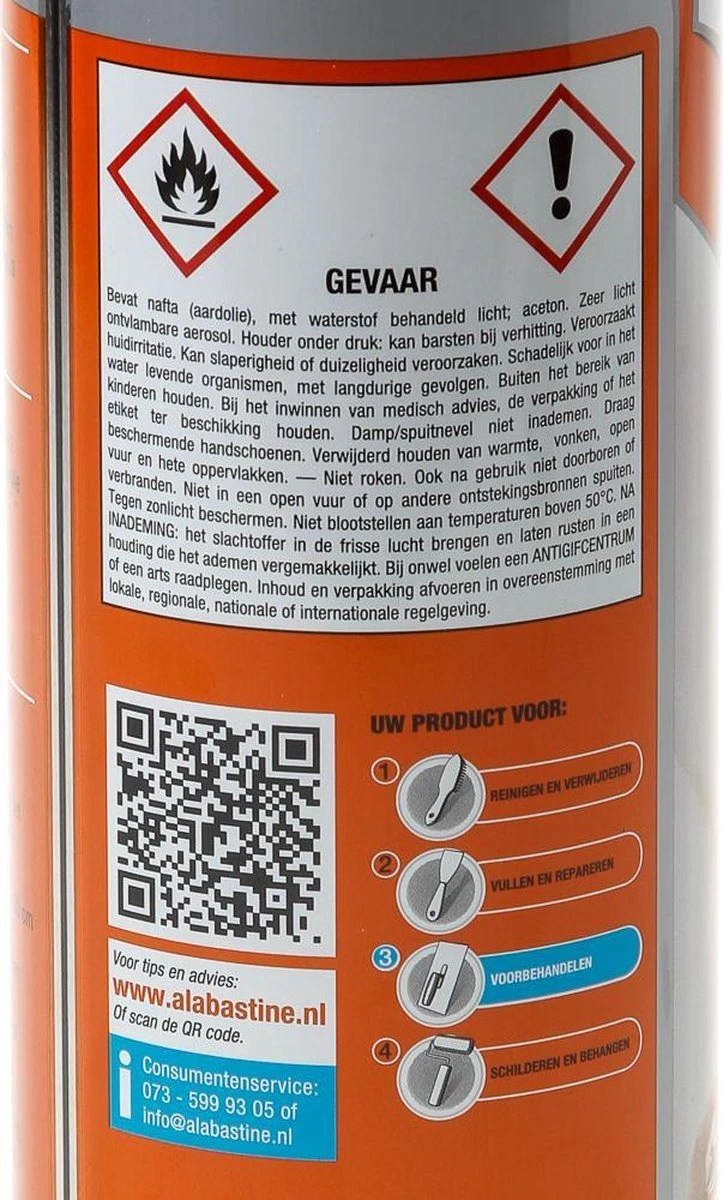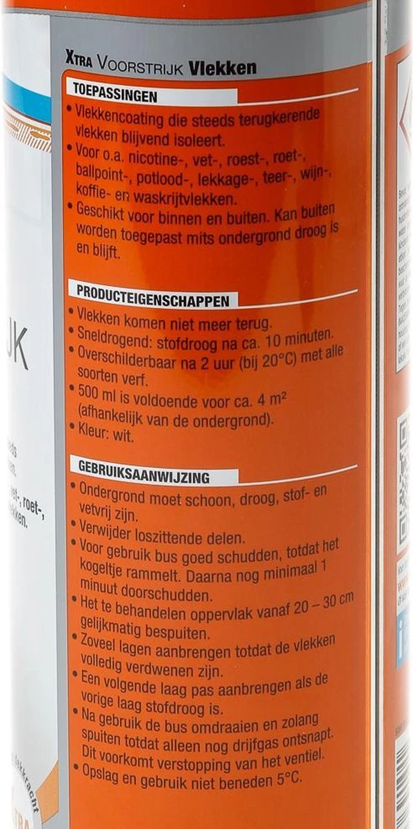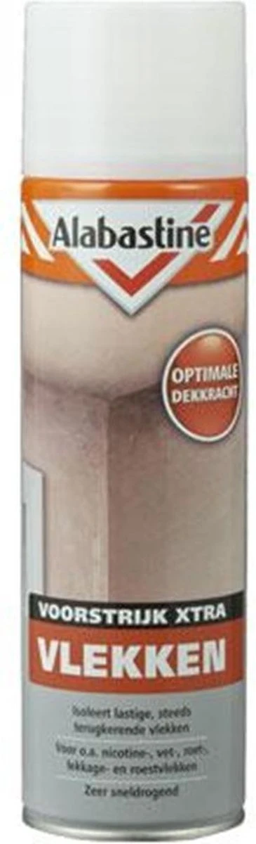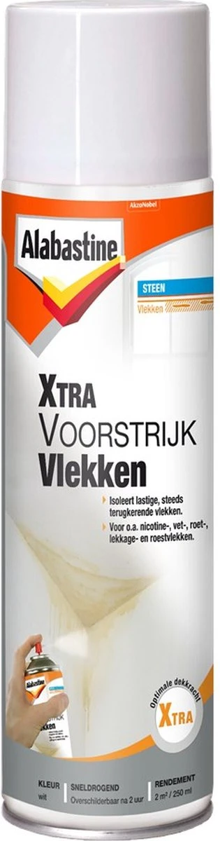 Met de Alabastine Xtra Voorstrijk Vlekken kunt u lastige en steeds terugkerende vlekken blijvend isoleren. Hierbij kunt u denken aan onder andere nicotine-, vet-, roest-, roet-, ballpoint-, potlood-, lekkage-, teer-, wijn-, koffie- en waskrijtvlekken. Deze Voorstrijk is verkrijgbaar is een spuitbus (500 ml). Voorstrijk Vlekken kan zowel op binnen- als buitenmuren worden toegepast. Bij het toepassen op een buitenmuur is het wel belangrijk dat de ondergrond droog is en blijft. Na 3 uur kunt u de Alabastine Xtra Voorstrijk Vlekken overschilderen met alle soorten verf. Het rendement van Alabastine Xtra Voorstrijk Vlekken is ongeveer 4m2 per 500 ml (afhankelijk van de ondergrond).
