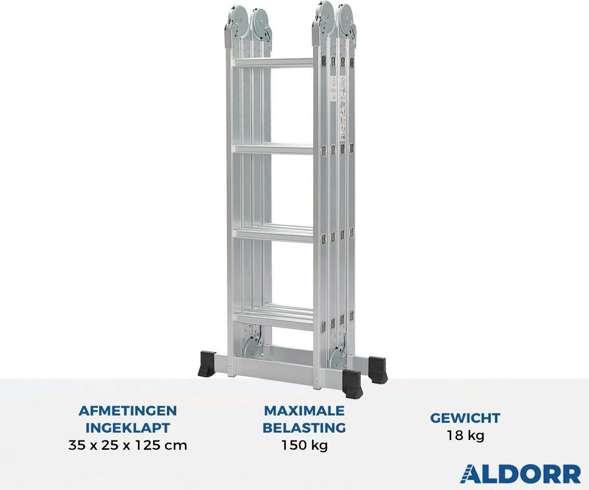 De ALDORR Home vouwladder met platformen is de ideale ladder voor verschillende klussen en bestaat uit 4 delen van 4 treden. Dankzij de hoogwaardige lichtgewicht aluminium constructie wordt elke klus veilig en gemakkelijk. De veelzijdige ladder is op vele manieren te gebruiken; zowel in de rechte stand, vouwstand (A-stand) in de platformstand, zoals afgebeeld op de foto’s. De brede stabilisatiebalk zorgt voor extra grip en comfort tijdens het gebruik van de ladder en de treden bevatten anti-slip profiel voor extra stabiliteit. De ladder voldoet aan de strenge Nederlandse veiligheidsnormen: NEN2484 en EN 131.