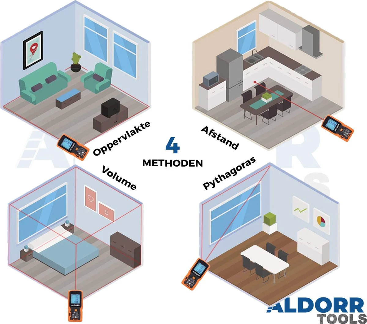 De laserafstandsmeter is multifunctioneel. Met de meter zijn vier verschillende metingen uit te voeren. Allereerst is met de meter afstand te meten. Daarnaast is het oppervlak van een ruimte te berekenen, door 2 metingen automatisch te combineren. Door 3 metingen te combineren is het volume van een ruimte te berekenen. Tot slot is een berekening uit te voeren met de stelling van Pythagoras. Alle metingen worden gedaan binnen maximaal 3 seconden en met een nauwkeurigheid van 1,5 mm.