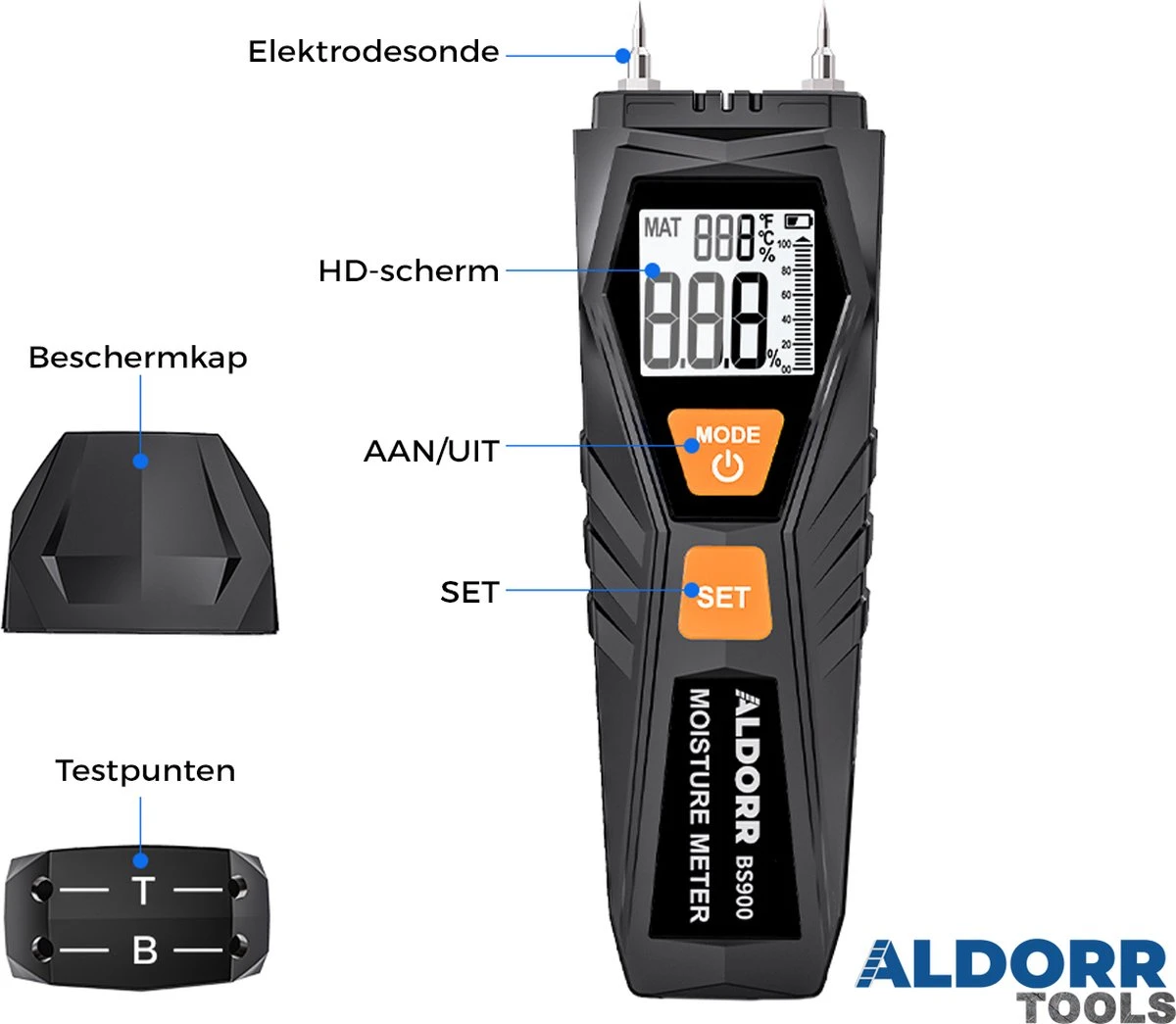 De ALDORR Vochtmeter is een betrouwbare en nauwkeurige oplossing voor het meten van het vochtgehalte in hout, vloeren en muren. Het digitale HD-scherm maakt het aflezen van de metingen gemakkelijk, zelfs in fel licht of schemer. De vochtmeter schakelt automatisch uit en heeft een datahold-functie om metingen te pauzeren en over te nemen.