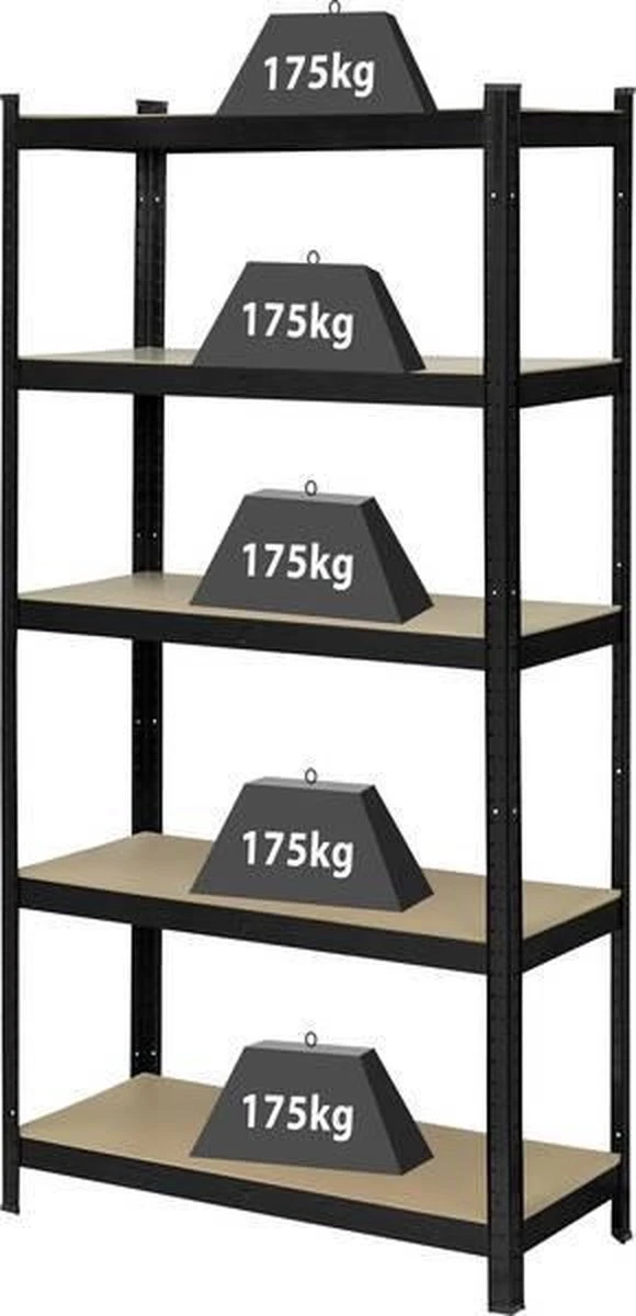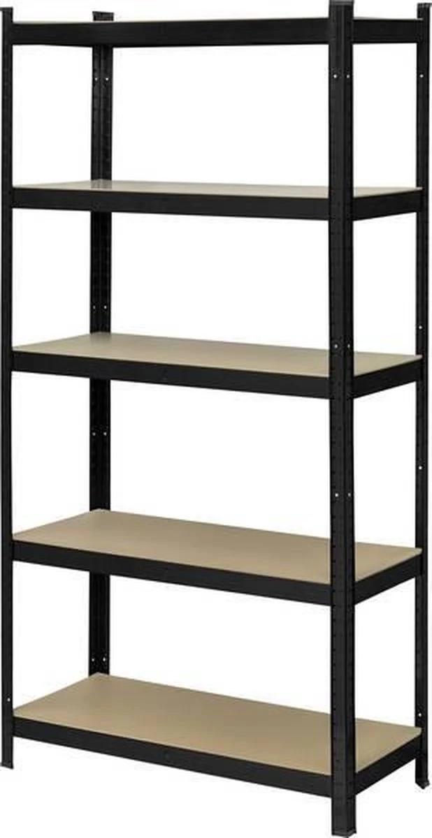 Basetech 2299892 Stellingkast extra stevig 175 kg (b x h x d) 900 x 1800 x 400 mm Metaal, MDF plaat Zwart, Verzinkt HarHet zwarte rek voor zware lasten heeft een eenvoudig insteeksysteem voor eenvoudige montage. Het metalen frame is perfect voor gebruik in vochtige ruimtes, kelder of garage. Onderhoudsvriendelijk gemoffeld metaal. Met middensteun voor hogere belastbaarheid.Montage zonder schroeven, eenvoudig in elkaar te zetten · Willekeurig plaatsbare legborden (om de 40 mm) · Geschikt voor in kelders, werkplaatsen etc.175 kg draagvermogen per legbord · Afgeronde randen · Eenvoudig en snel te monteren8x standaard, Gebruiksaanwijzing., 20x draagrails, 5x centrale dwarsbalk, 5x MDF-platen
