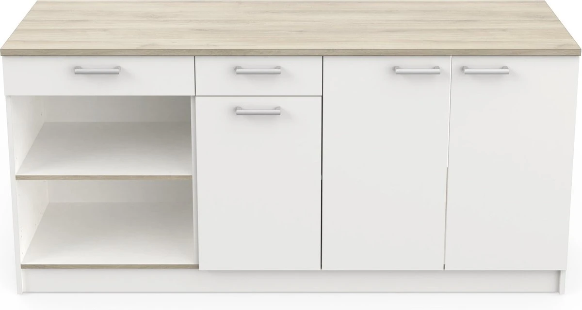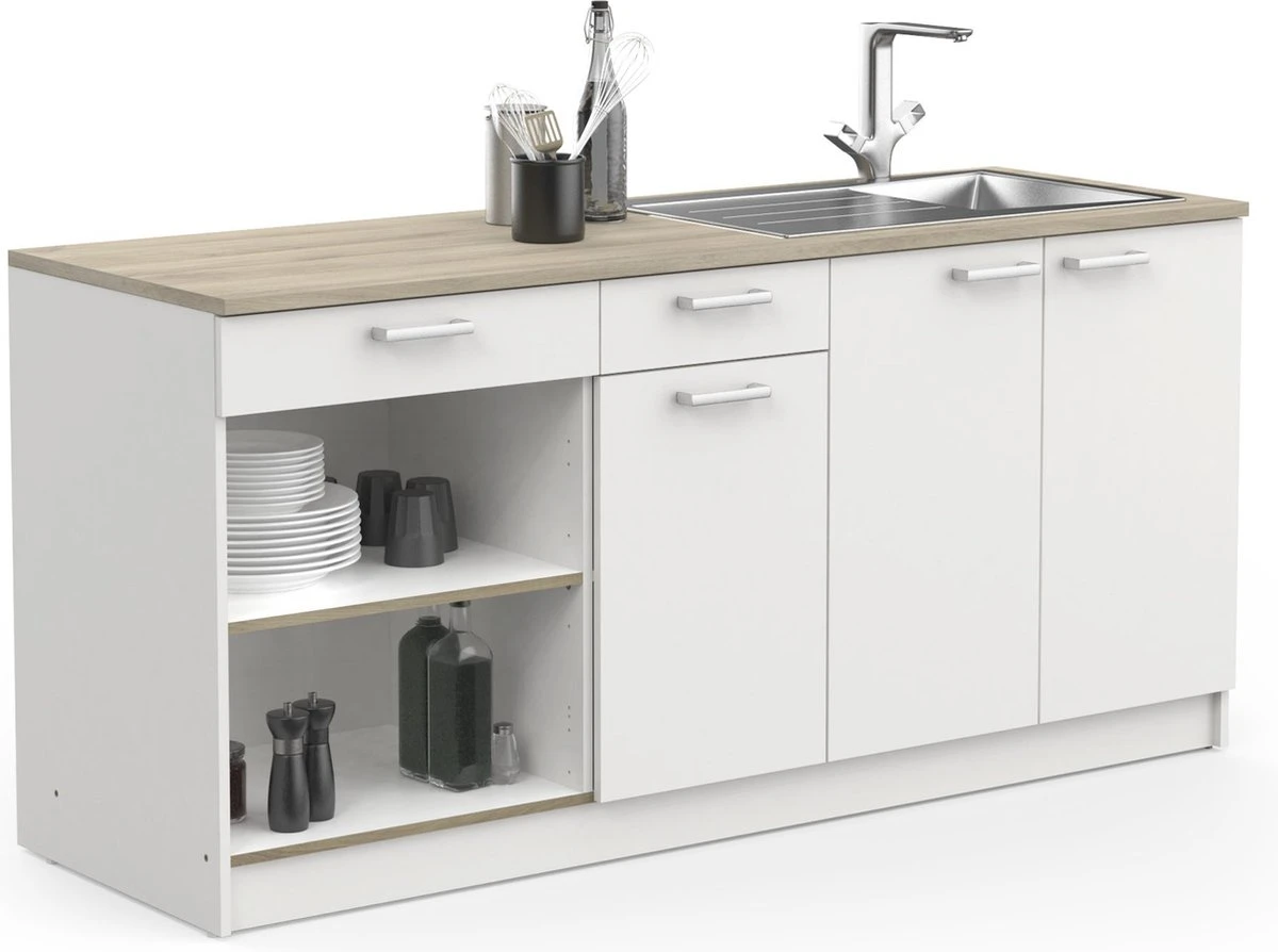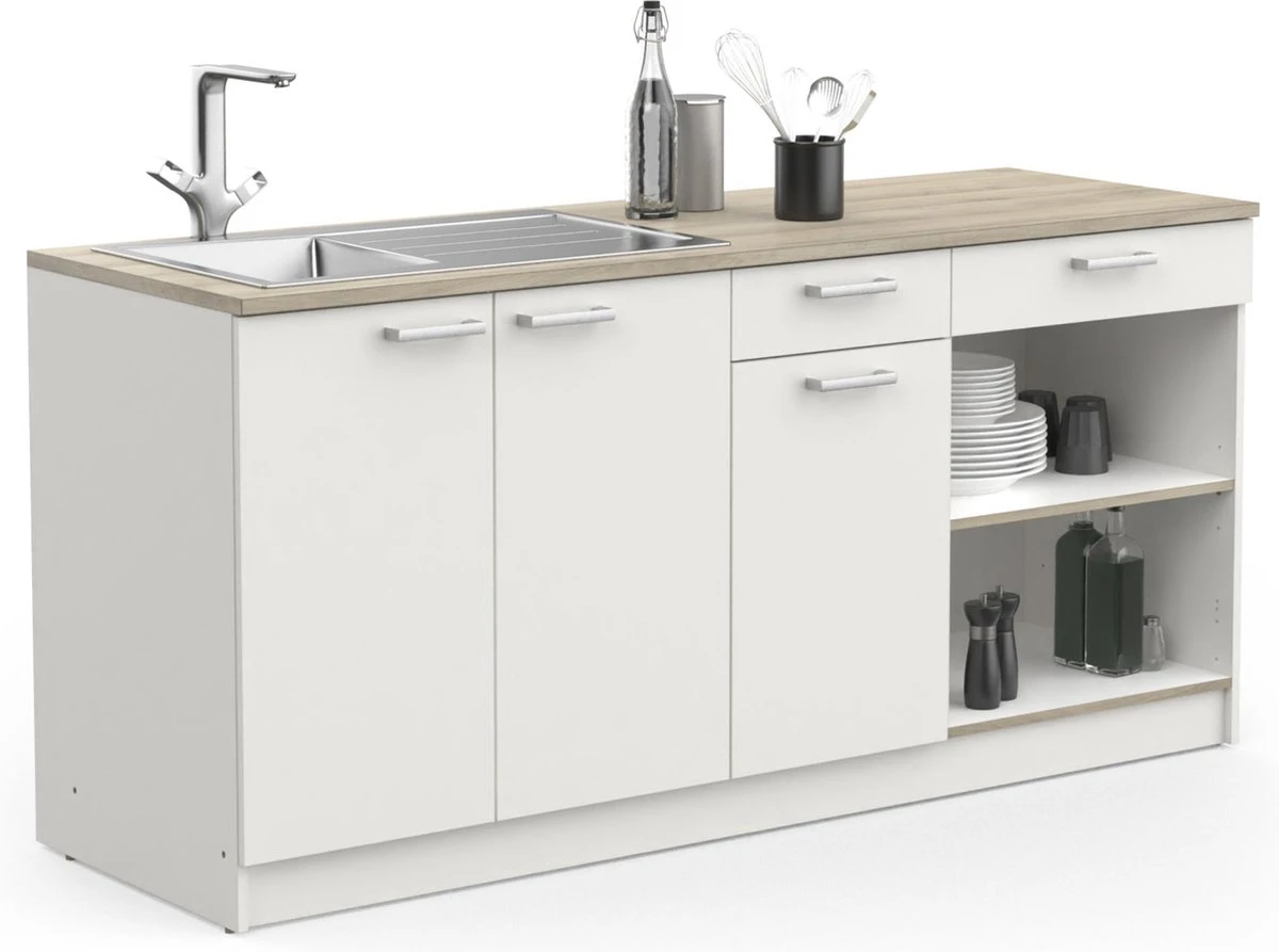 Deze onderkast bestaat uit drie delen waaronder een spoelbak afgesloten door twee deuren, een ladedeel met daaronder een deur die open kan en een plank.