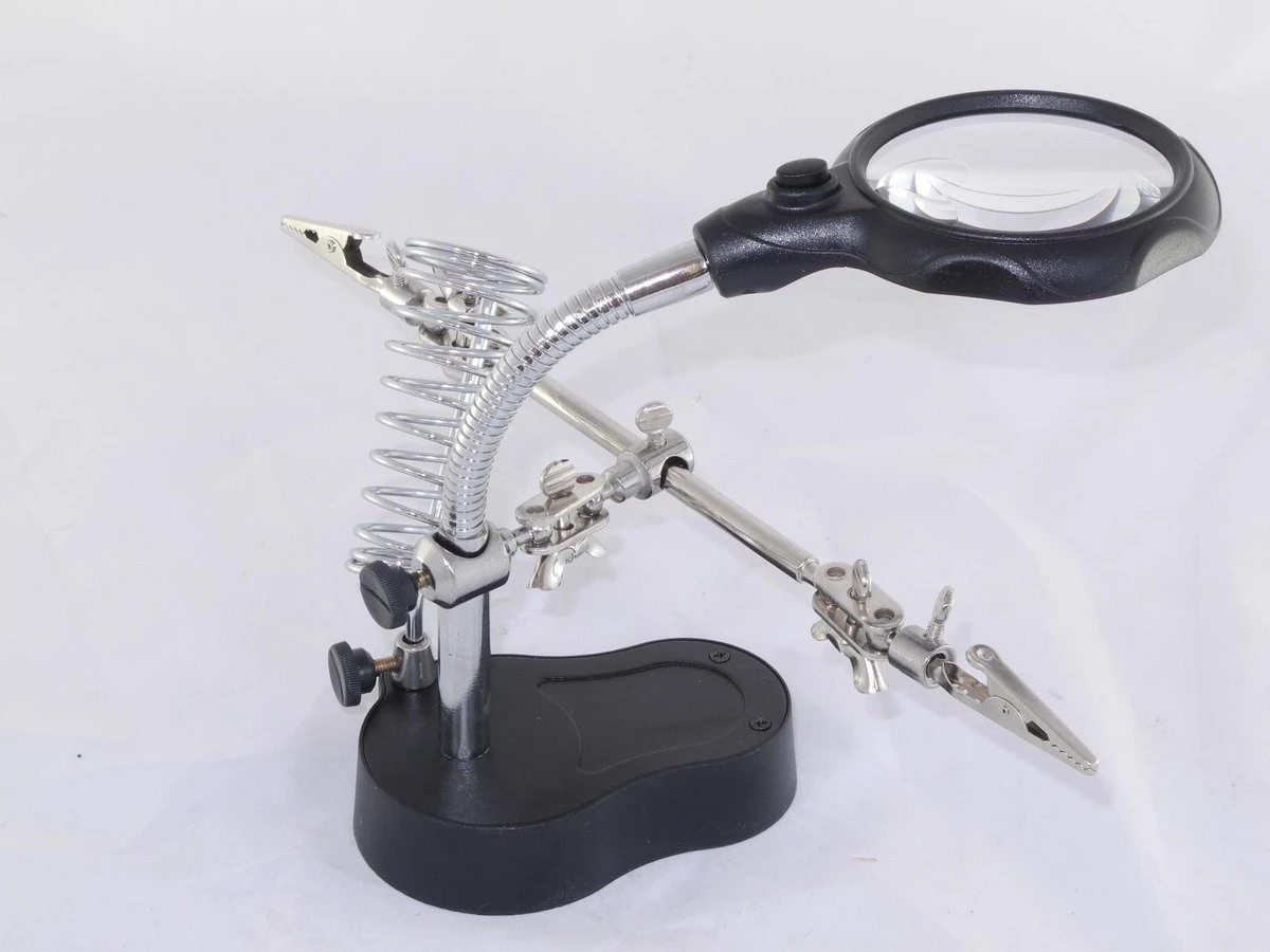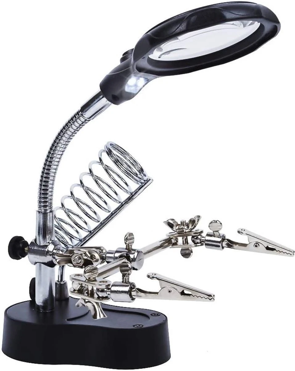 Daar waar 2 handen niet genoeg zijn, komt een derde handje goed van pas! het derde handje is te gebruiken wanneer je bijvoorbeeld bezig bent met o.a. Soldeerwerk en andere precisie werkjes! het derde handje beschikt over 2 heldere leds wat het extra makkelijk maakt wanneer in je in het donker aan het werk bent. Daarnaast beschikt het derde handje over maar liefst 2 lenzen. Verder beschikt het derde handje over een soldeerbouthouder. Het derde handje werkt op 3 × AAA-batterijen (inclusief).