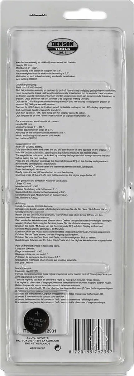 Deze zwaaihaak is voor het nauwkeurig en makkelijk overnemen van hoeken. De winkelhaak is digitaal en is exclusief batterij CR2032, het is nauwkeurig in te stellen in stappen van 0.1 graden en de nauwkeurigheid van de elektronische meting is ± 0.5 graden. De zwaaihaak heeft een metrische en inch schaalverdeling aan beide zwaaihaken.