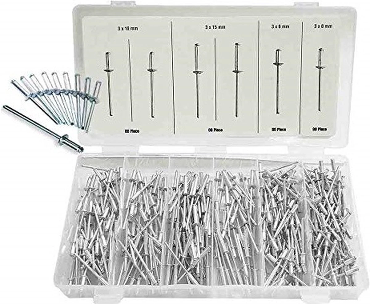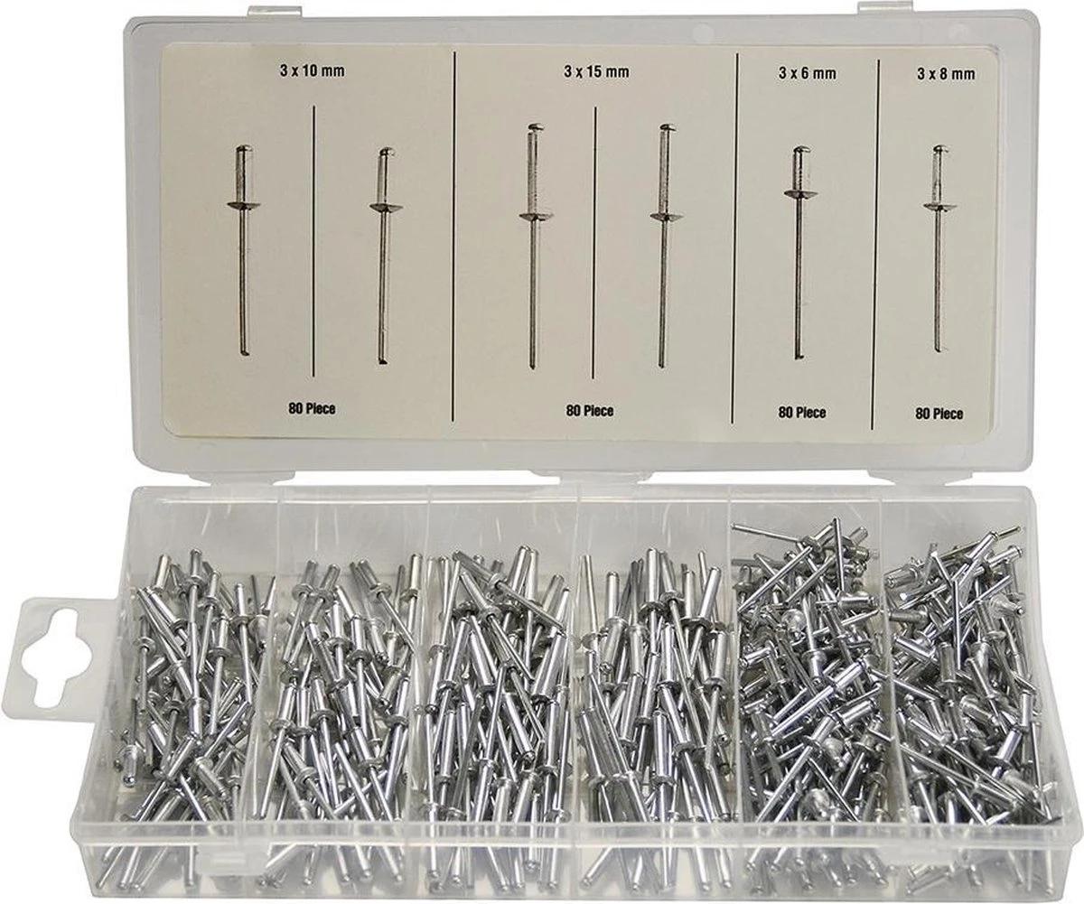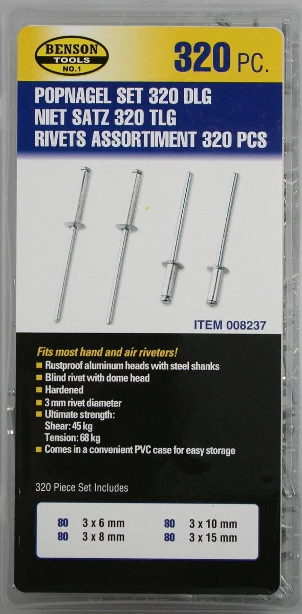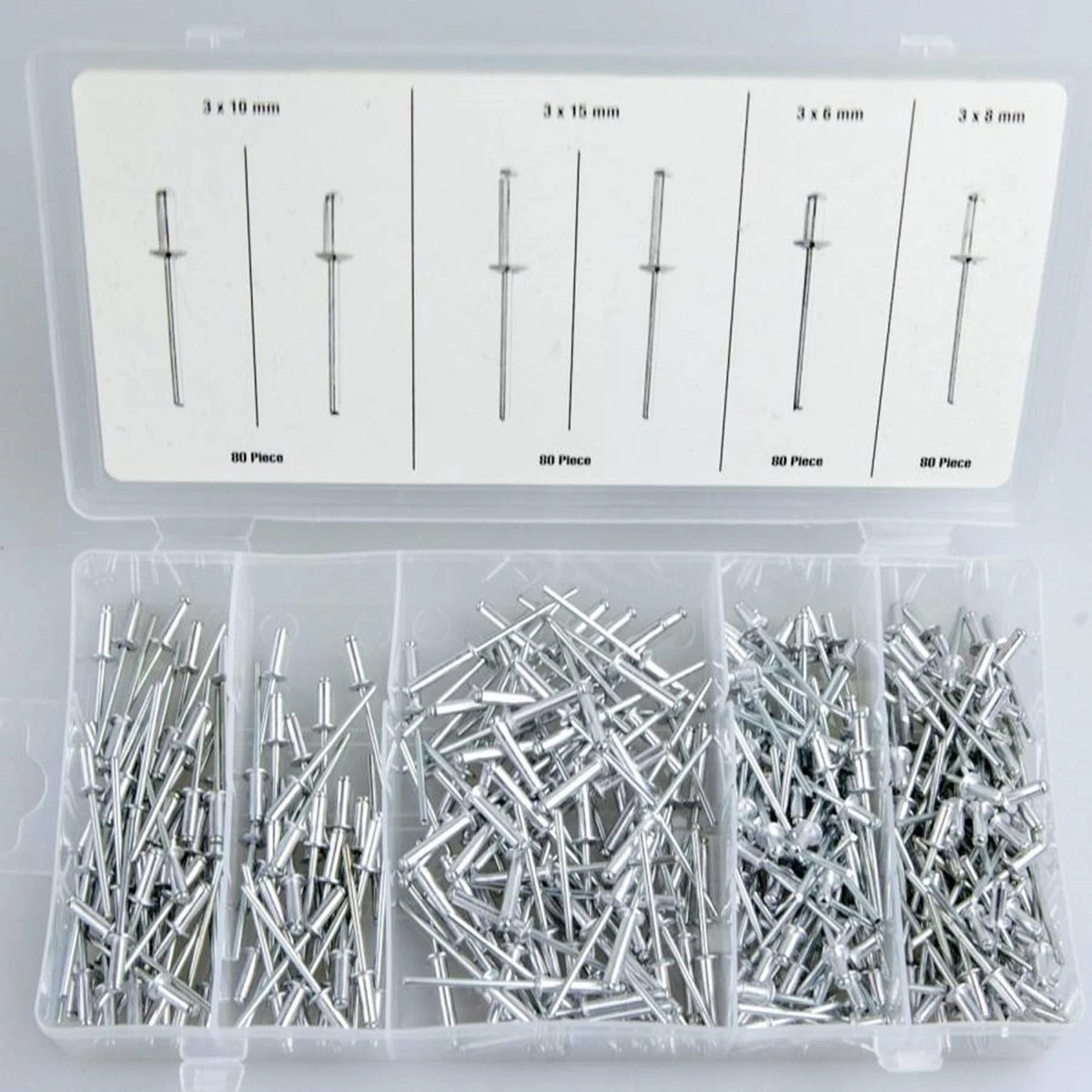 De popnagels zijn gemaakt van gehard staal en voorzien van een platte ronde kop gemaakt van aluminium.