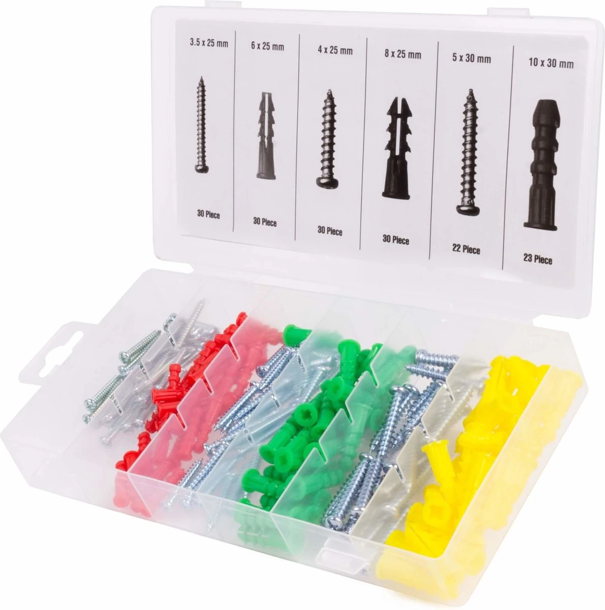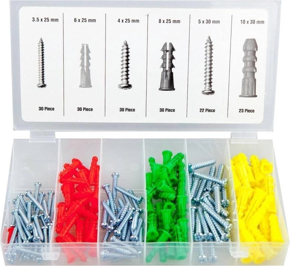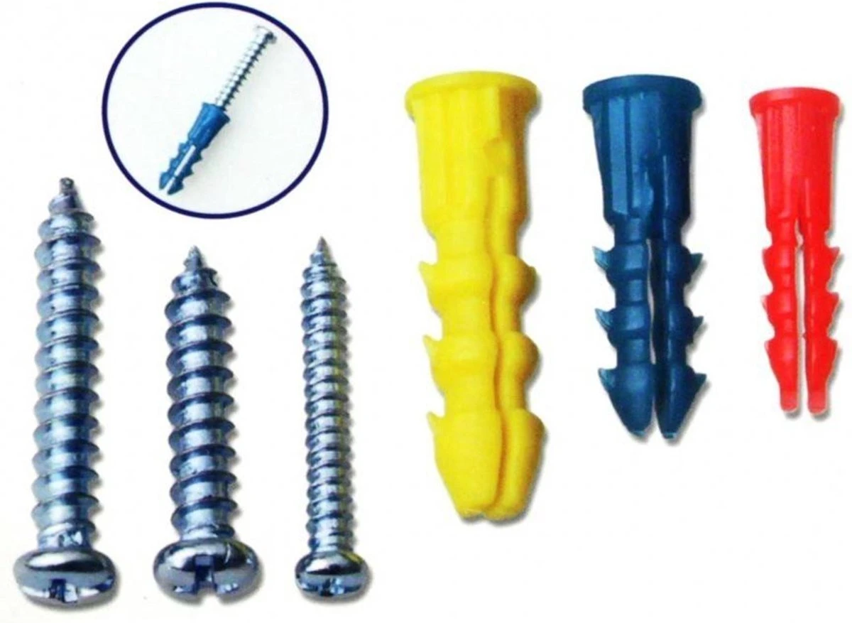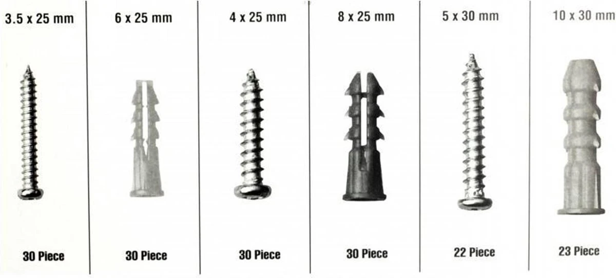- Pluggen: 30 stuks 6 × 25 mm, 30 stuks 8 × 25 mm, 23 stuks 10 × 30 mm.