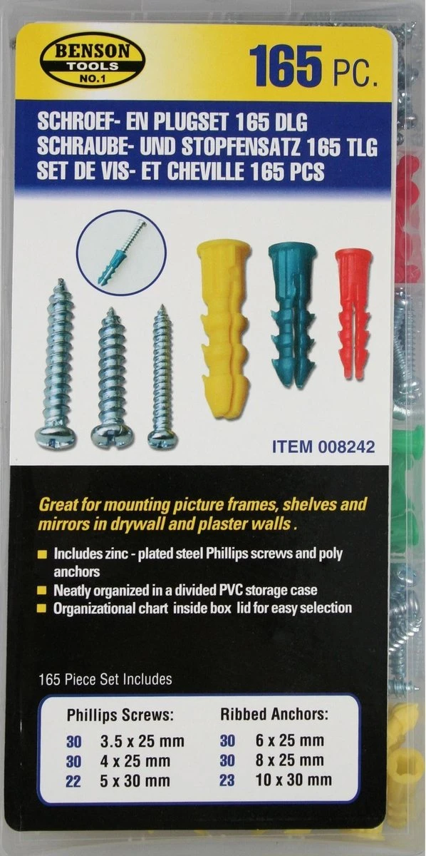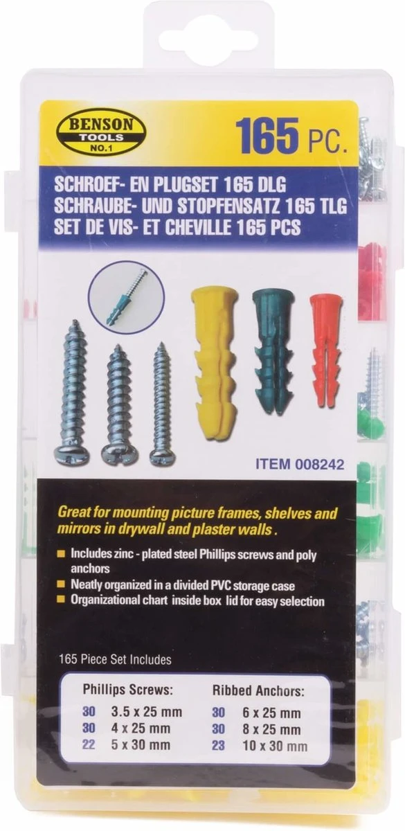 Onze uitgebreide 165-delige set met schroeven en pluggen is ideaal voor doe-het-zelf en professionele doeleinden. Geleverd in stevige assortiment box