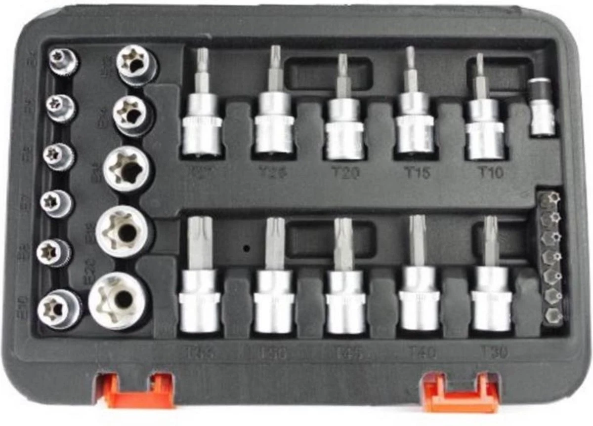 - T10 – T15 – T20 – T25 – T27 – T30 – T40 – T45 – T50 – T55 met 3.8 “vierkante aansluiting
