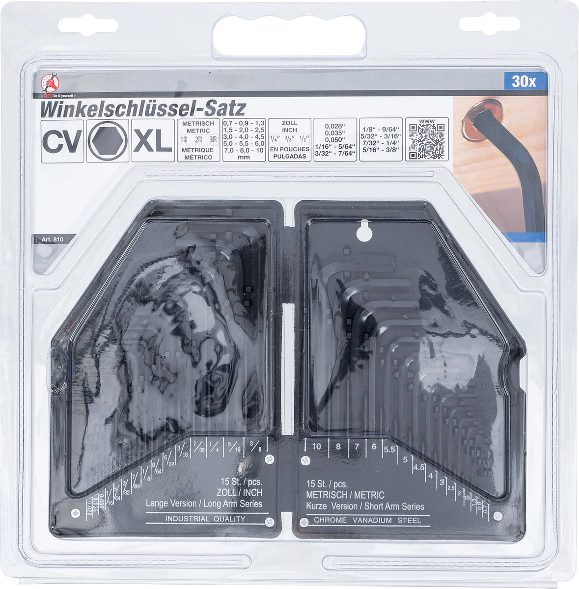 De BGS Inbussleutel Set is een handige compacte set met de dertig meest voorkomende formaten inbussleutels. Het gaat hier om de metrische inbussleutels: 0,7 – 0,9 – 1,3 – 1,5 – 2 – 2,5 – 3 – 4 – 4,5 – 5 – 5,5 – 6 – 7 – 8 – 10 en de inchmaten inbussleutels 0.28 – 0.35 – 0.50 – 1/16 – 5/64- 3/32 – 7/64 – 1/8 – 9/64 – 5/32 – 3/16 – 7/32 – 1/4 – 5/16 – 3/8.
