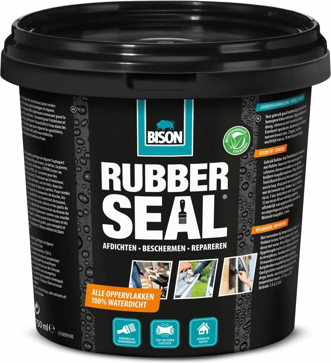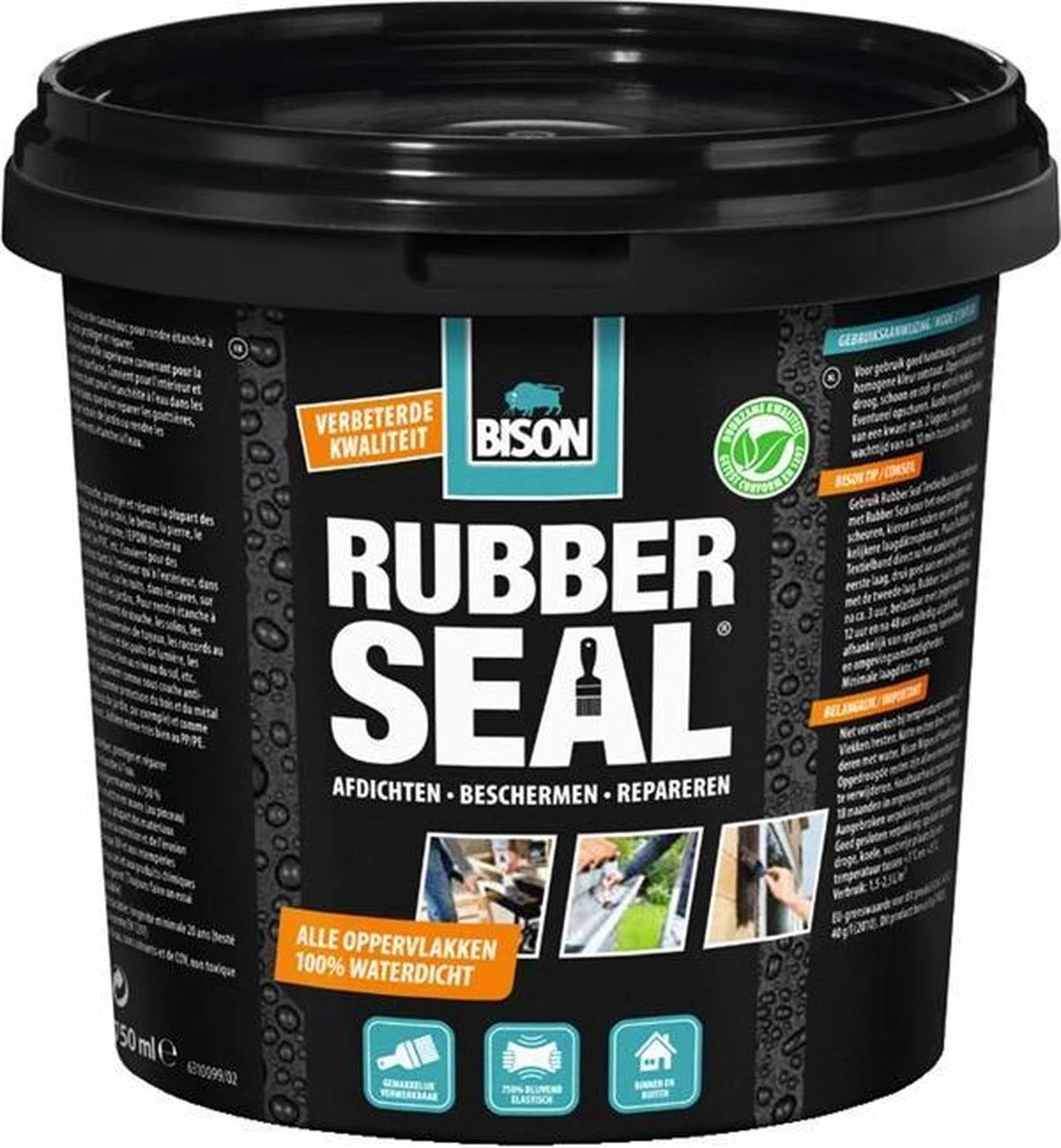 Met Bison Rubber Seal haal je één product in huis dat je voor bijna alle ondergronden kunt gebruiken. De superieure universele kwaliteit van Bison Rubber Seal hecht op vrijwel alle materialen, namelijk hout, beton, steen, metaal, zink, bitumen, EPDM, PVC en heeft zelfs een goede hechting op polypropyleen en polyethyleen (PP/PE). Of je nu een lekkage in je badkamer wilt voorkomen of je gevel en tuinhout wilt beschermen tegen vocht, met Bison Rubber Seal maak je snel en eenvouding 1001 toepassingen binnen- en buitenshuis waterdicht. Denk bijvoorbeeld aan het waterdicht maken van douchegoten, aansluitingen tussen vloer en muur, dakgoten, buisdoorvoer-, kozijn- en lichtkoepelaansluitingen en het beschermen van buitenmuren tegen optrekkend en doorslaand vocht. Maar je kunt Bison Rubber Seal ook goed gebruiken als beschermende coating van metaal en hout, bijvoorbeeld tegen corrosie en houtrot.
