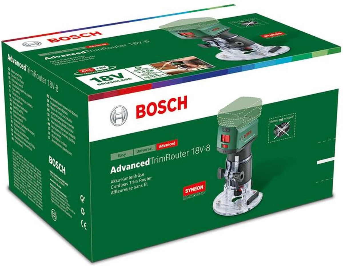 De compacte AdvancedTrimRouter 18V-8 is licht en comfortabel in gebruik dankzij het compacte ontwerp en een gering gewicht van slechts 1,1 kg. Borstelloze motortechnologie van Bosch stelt het hoogste vermogen beschikbaar voor het frezen van sleuven of uitsnijden van letters en motieven in hout, waarbij bovendien een aanzienlijk langere levensduur van de machine verzekerd is.