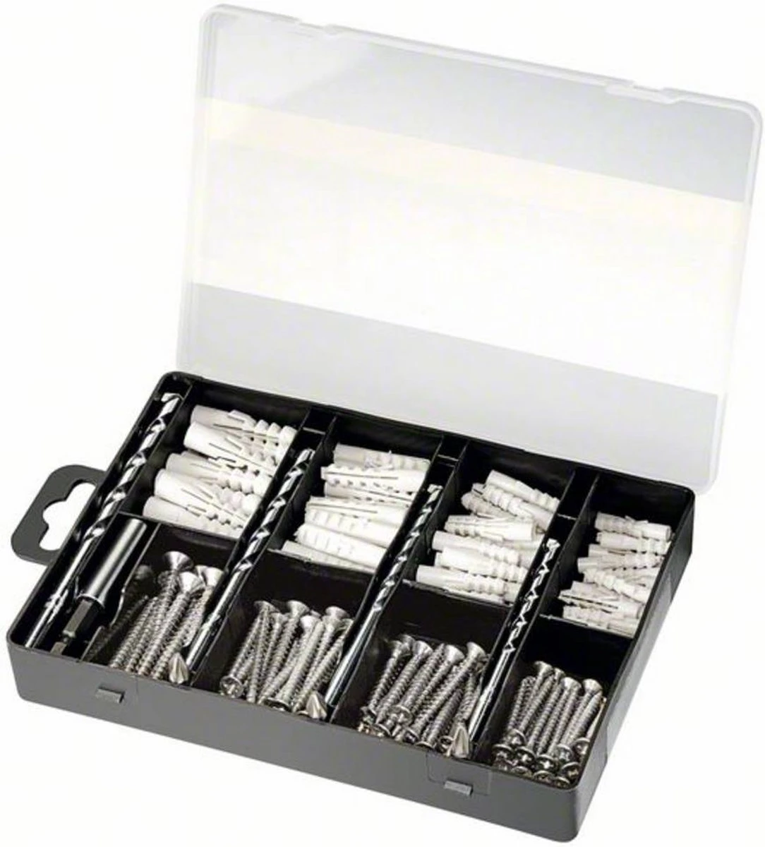 De Bosch bevestigings set bestaat uit 4 hardmetalen steenboren, 3 schroefbits, 90 pluggen en 75 schroeven. Een magnetische bithouder is in de set inbegrepen.