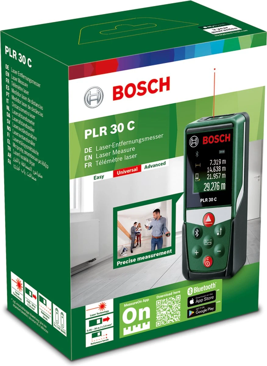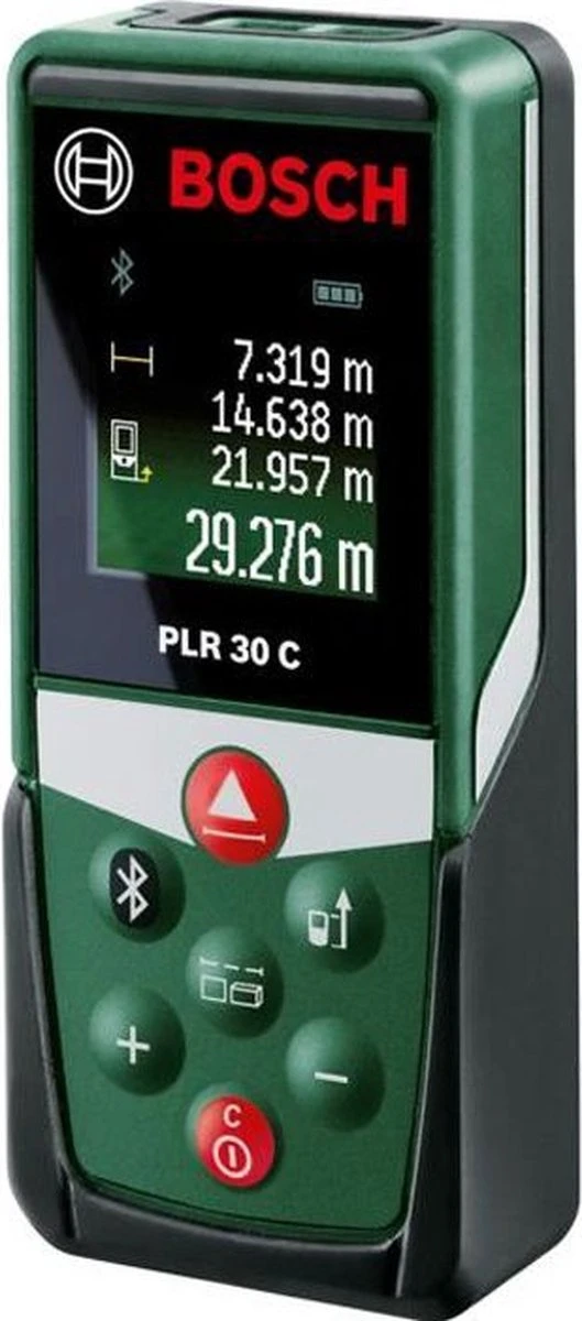 Het plannen van renovaties heeft u in de vingers. Niet alleen meet de PLR 30 C afstanden tot 30 m met laserprecisie, maar laat ook meubelafmetingen in een oogwenk zien. Met de geïntegreerde functies kunnen oppervlakte en inhoud worden berekend om de hoeveelheid materiaal te bepalen die nodig is voor klussen zoals het leggen van vloeren en zelfs het behangen en verven van muren. Resultaten verschijnen op een hoogwaardig kleurendisplay voor optimale leesbaarheid. Alle gegevens kunnen naar de Bosch app worden verzonden voor digitaal documenteren en plannen van projecten, zodat tijd wordt bespaard en fouten worden vermeden.
