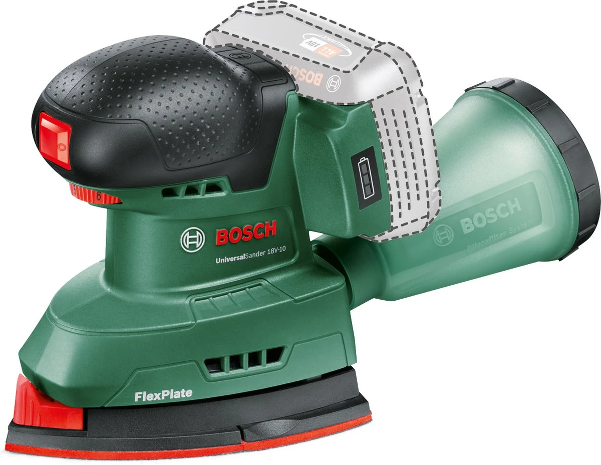 De accu is compatibel met alle machines van het Bosch 18-V-systeem. Een verder pluspunt van de UniversalSander 18V-10 is de integratie van het Bosch microfiltersysteem. De accumultischuurmachine is uitgerust met een stofzuigelement dat het stof direct in de meegeleverde microfilterbox afzuigt. Dit vermindert het vrijkomende stof bij schuurwerkzaamheden tot een minimum.