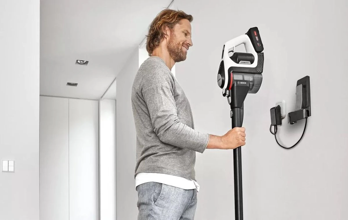 Dankzij het slanke, aantrekkelijke en functionele ontwerp van de Bosch Unlimited 8 steelstofzuiger kan hij gemakkelijk worden opgeborgen en opgeladen in het aan de muur bevestigde docking station.