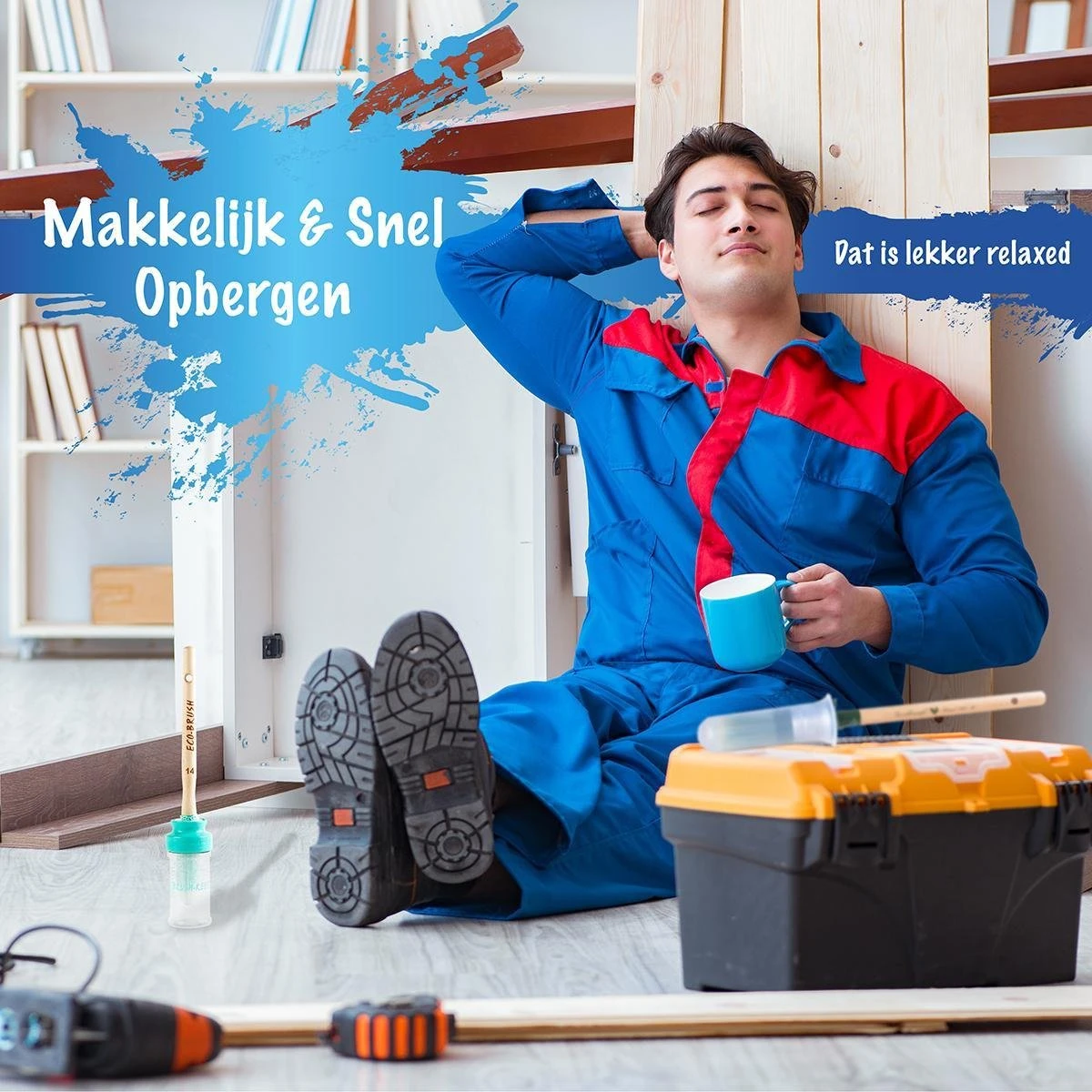 Dé oplossing tegen uitgedroogde verfkwasten! Je stopt de kwast, zonder eerst schoon te maken, in de houder zodat deze niet uitdroogt of beschadigt en vult hem met water als je hem langer dan 5 dagen wilt opbergen. Dan is hij binnen enkele dagen vanzelf schoon! Zo heb je altijd een professionele gebruiksklare verfkwast in huis geschikt voor acryl en alkyd.