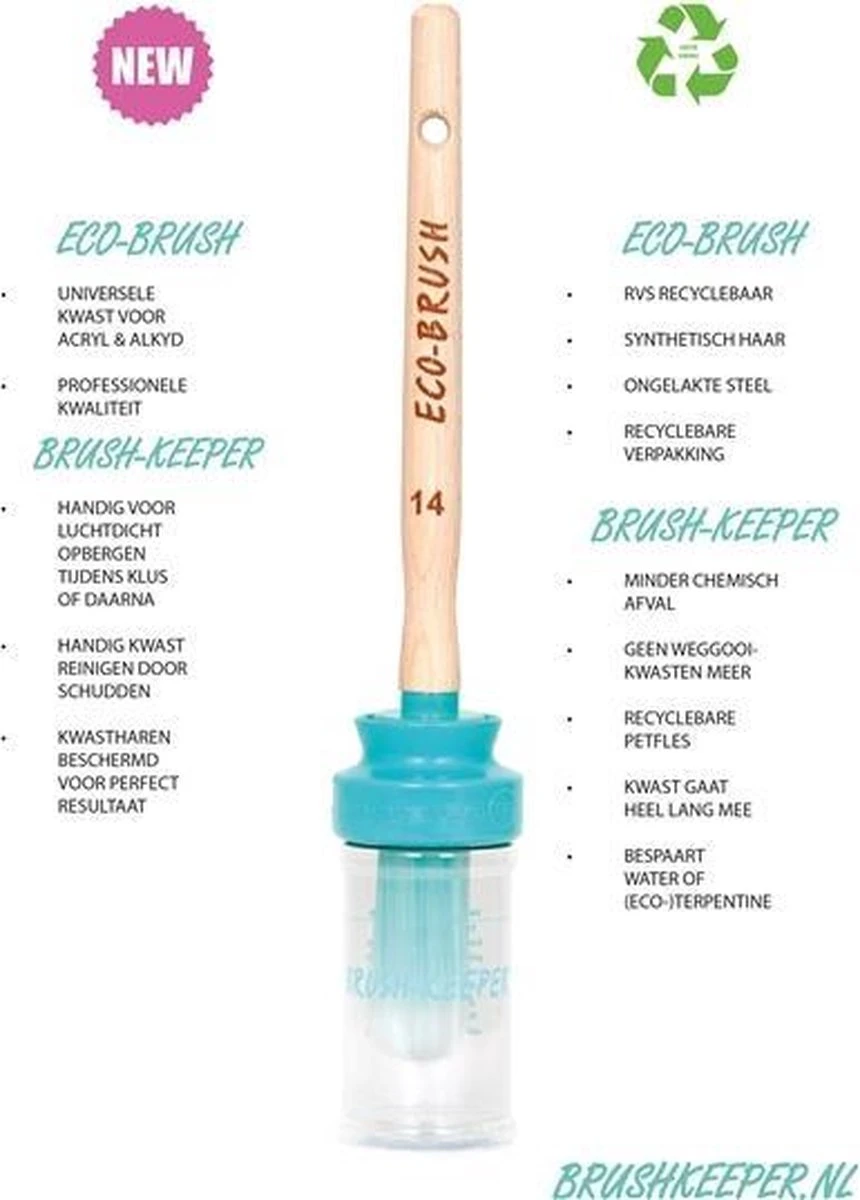 BrushKeeper is handig en bespaart miljoenen weggooi-kwasten, veel chemisch afval zoals terpentine en folie met verf, is duurzaam gefabriceerd in Nederland met een zo klein mogelijke CO2 footprint, bestaat uit recyclebare PET fles, RVS bus, synthetische haren (zowel geschikt voor acryl als alkyd), FSC gekeurde ongelakte steel, recyclebare verpakking en toonbankdisplay. Hierdoor is EcoBrush, met BrushKeeper, de meest duurzame verfkwast die er bestaat, gaat jarenlang mee maakt de wereld mooier en schoner. Een fantastisch eco-cadeau voor familie en vrienden!”