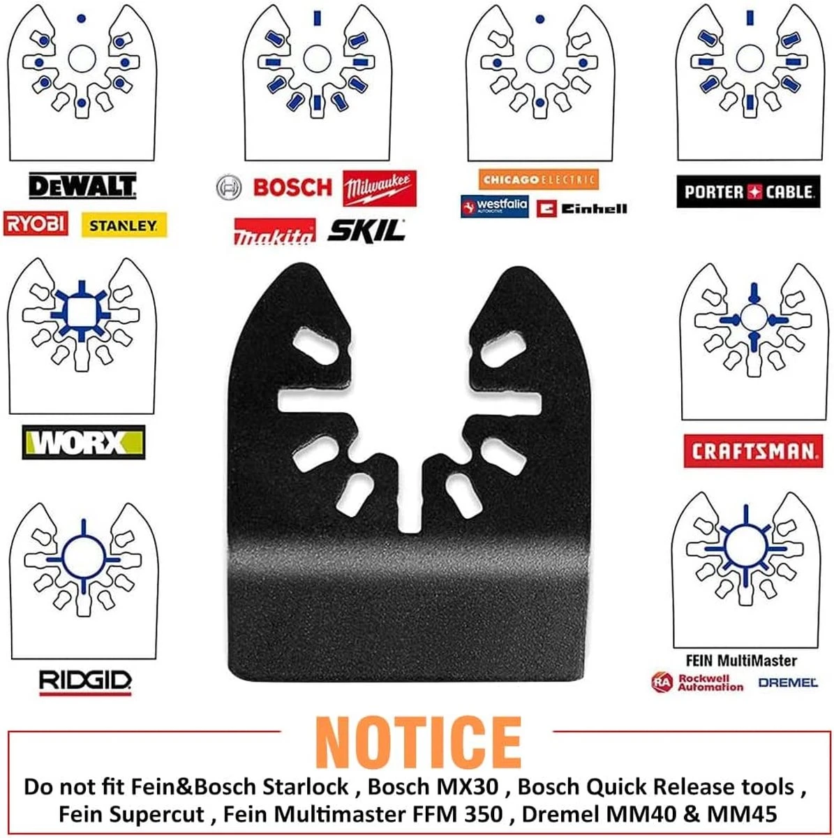 - Compatibel met: Deze oscillerende zaagbladen zijn geschikt voor Ryobi RMT1801M, RMT200, RMT12011L Milwaukee M12, M18, Bosch Professional GOP10,8 VLI, GOP 250 300 AEG, Bosch Multi-X (maar niet geschikt voor MX30 PMF350). Niet compatibel met snelwisselgereedschappen, niet compatibel met Black Decker BD Matrix, Dremel MM40,45, WORX 20 V Max, Worx Wx682.9, Dewalt DCS355, niet compatibel met Bosch & Fein Starlock (inclusief Starlock, Starlock Plus, Starlock Max).