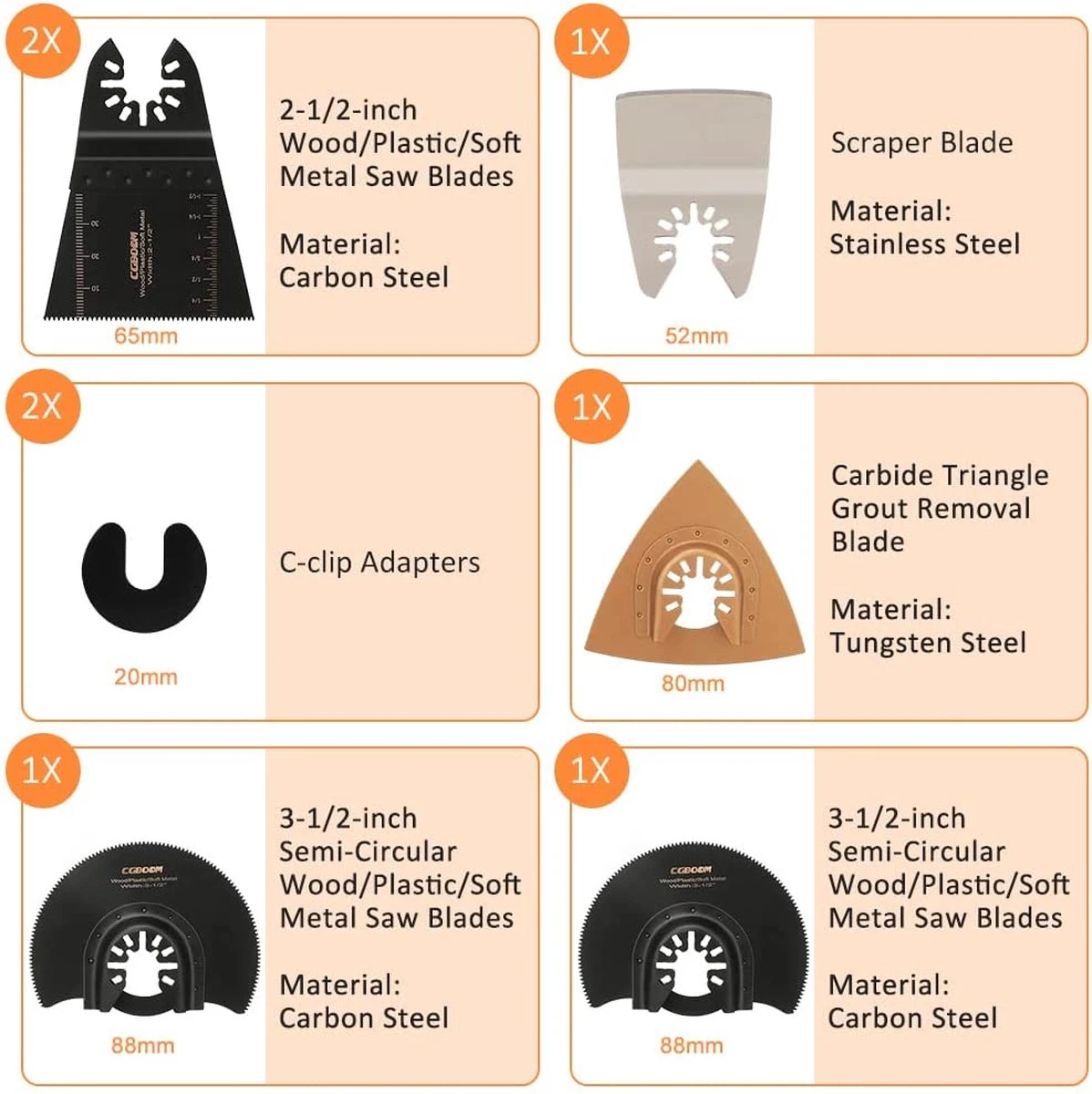 - Veelzijdig gebruik: Deze accessoires voor meerdere gereedschappen kunnen thuis, in de werkplaats of op andere plaatsen worden gebruikt, bijvoorbeeld bij het zagen of snijden van metaal, hout, kunststof, bij het slijpen van hardhout, bij het verwijderen van verf, bij het schuren en slijpen van cement, enz.