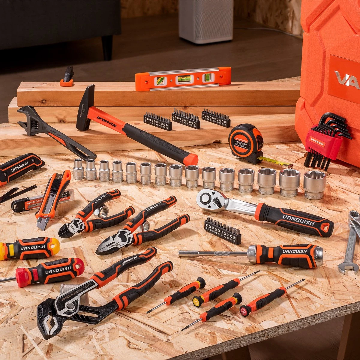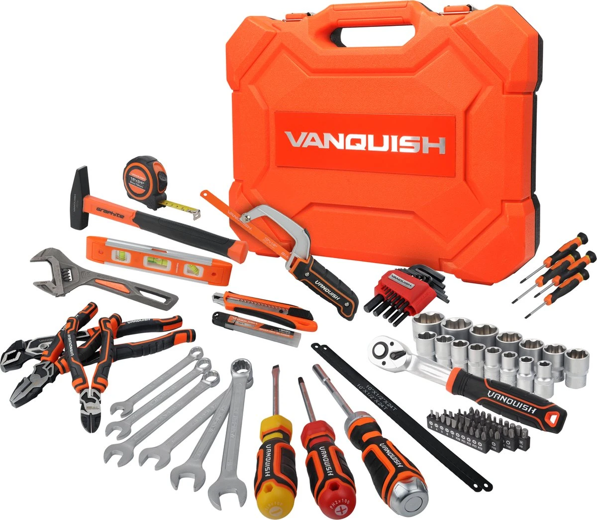 Complete professionele gereedschapsset van het merk Vanquish. Deze set is door ons team samengesteld met tools die iedere klusser in huis moet hebben. De gereedschappen zijn, in tegenstelling tot de meeste andere merken, gemaakt van hoogwaardig Chrome-vanadium staal met stevige handgrepen. De tools zijn gemaakt volgens de Europese maten en worden ook gebruikt in de proffesionele markt.