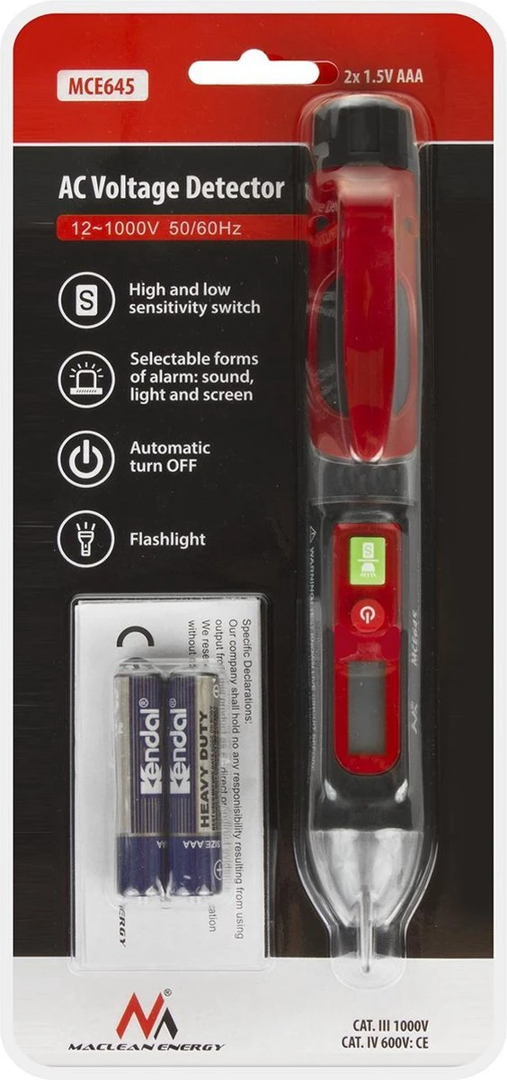 De spanningstester werkt op 2 AAA-batterijen. Batterijen zijn inbegrepen in de set met het product. Automatische uitschakeling zorgt voor een lange levensduur van de batterij.