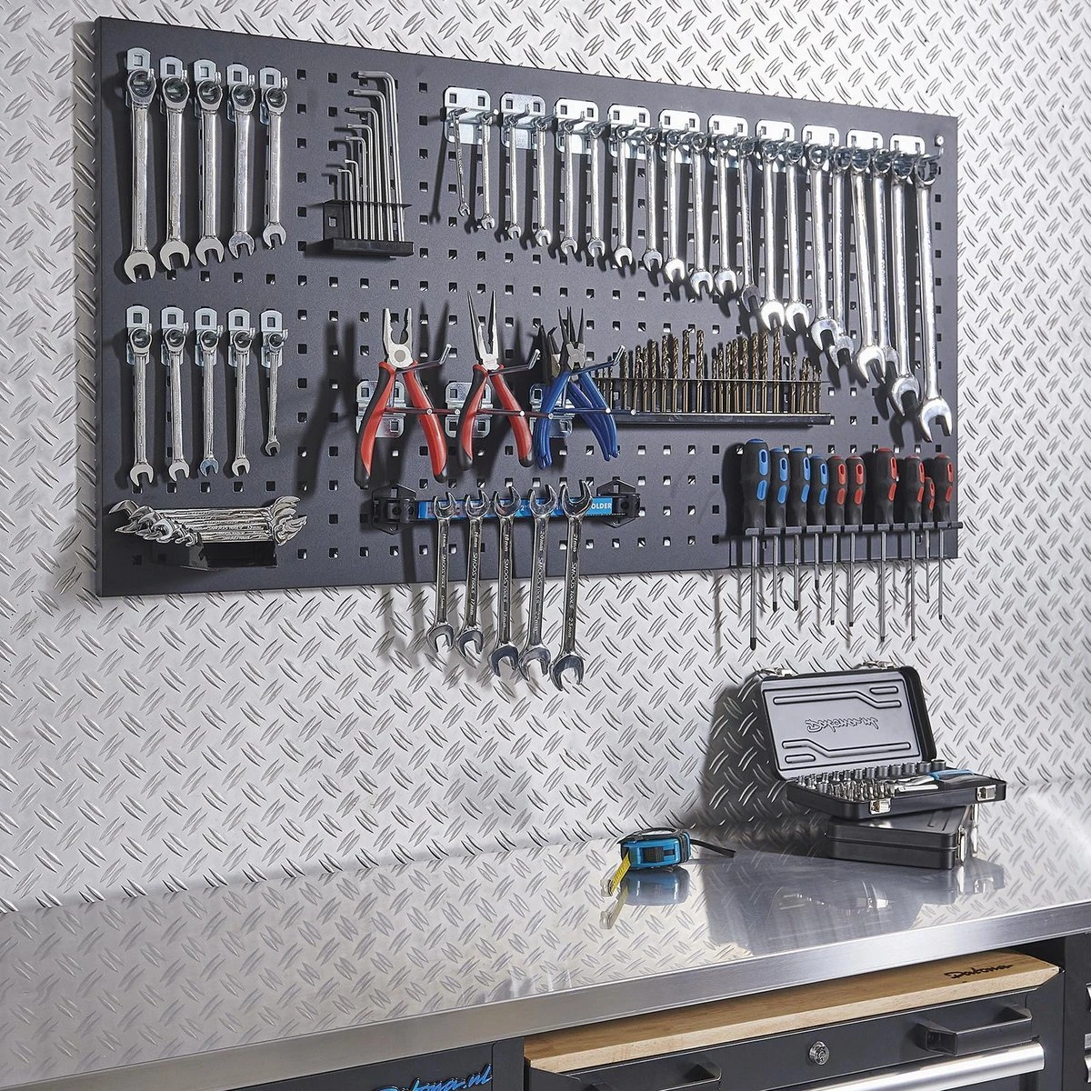 De manier om al jouw speciaalgereedschap in één oogopslag te ordenen. Dit metalen hangbord is eenvoudig te monteren achter een werkbank of gewoon aan de muur. Met het ruime assortiment van Datona gereedschapshaken kunt u elk stukje gereedschap stevig en overzichtelijk opbergen aan deze wandplaat. Niet alleen voor werkplaatsen of hobbyruimtes is dit gatenbord onmisbaar, maar ook een “must” als een onderdeel van jouw bedrijfswagen inrichting. De afmetingen van de gaten is 10,5 x 10,5 mm (R38), de ruimte die tussen de gaten zit is 25 mm. De afmetingen van dit gereedschaprek is 122 x 61 cm en is afgewerkt met een krasvaste poedercoating zodat het gereedschap bord ook mooi blijft.