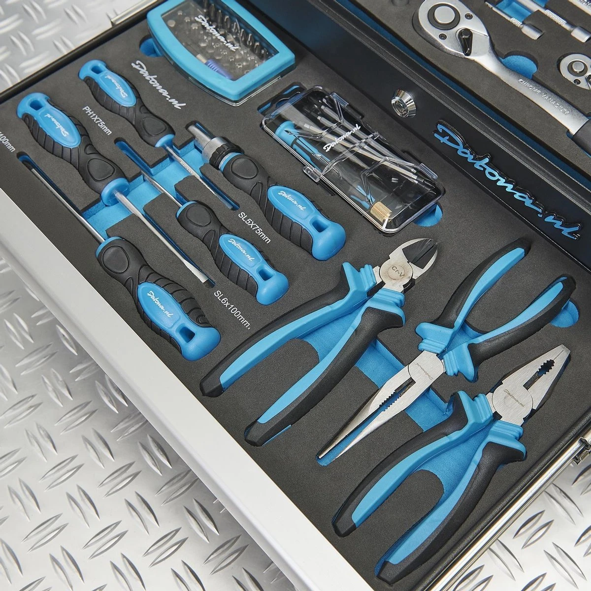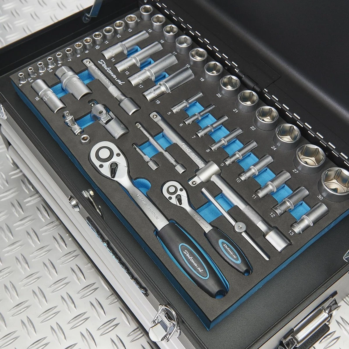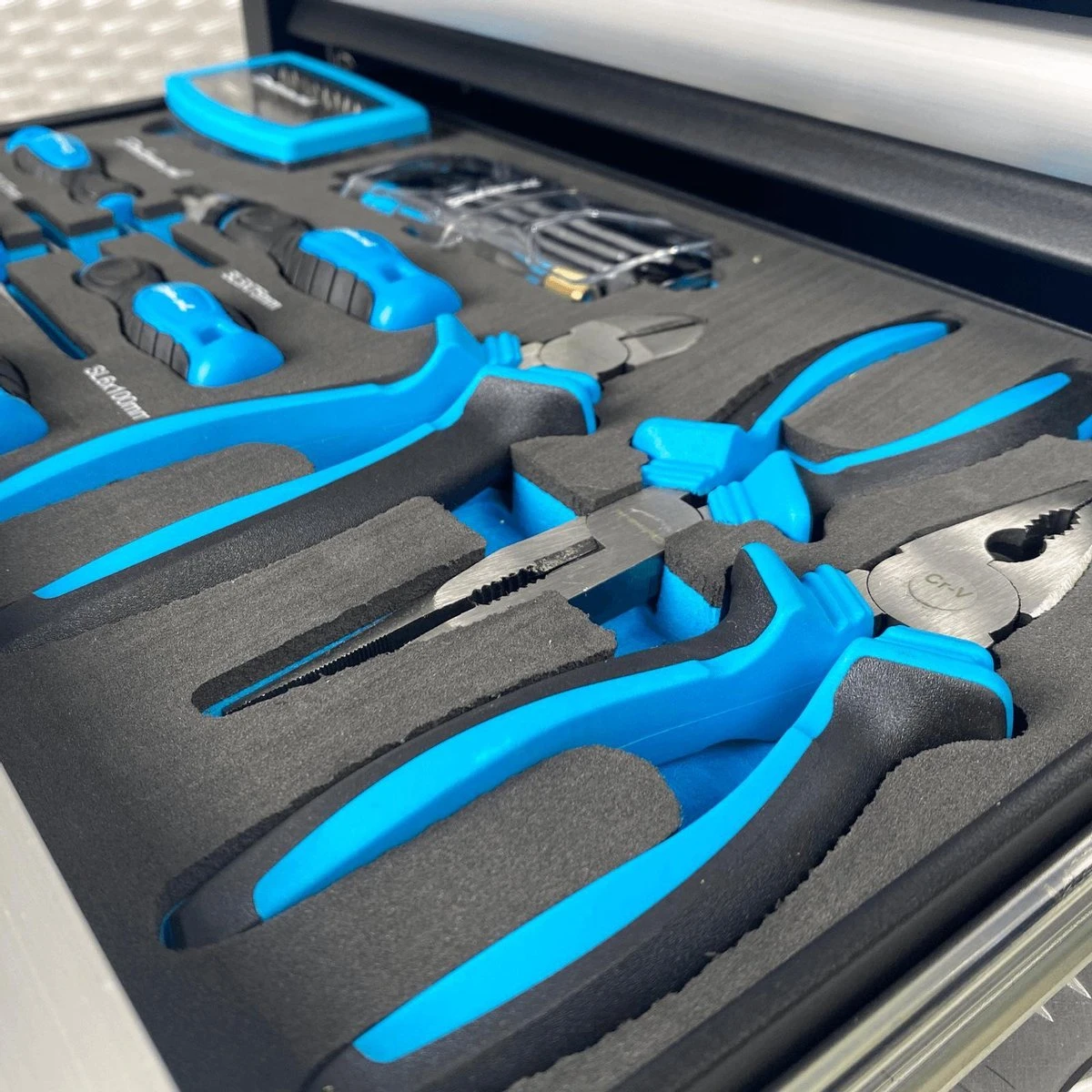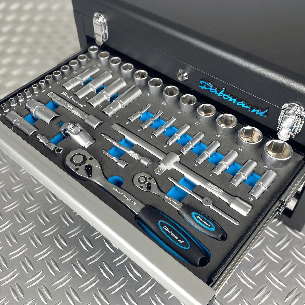 Deze gereedschapskist is ideaal voor mensen die graag hun gereedschap meenemen naar bijvoorbeeld het circuit. Hij beschikt namelijk over twee handvaten aan de zijkanten en is compact van formaat. Er zijn in totaal 5 plekken waar je gereedschap kunt opbergen; 3 lades en onder de klep is nog een extra plek. Die klep is af te sluiten door middel van een slot met sleutel.
