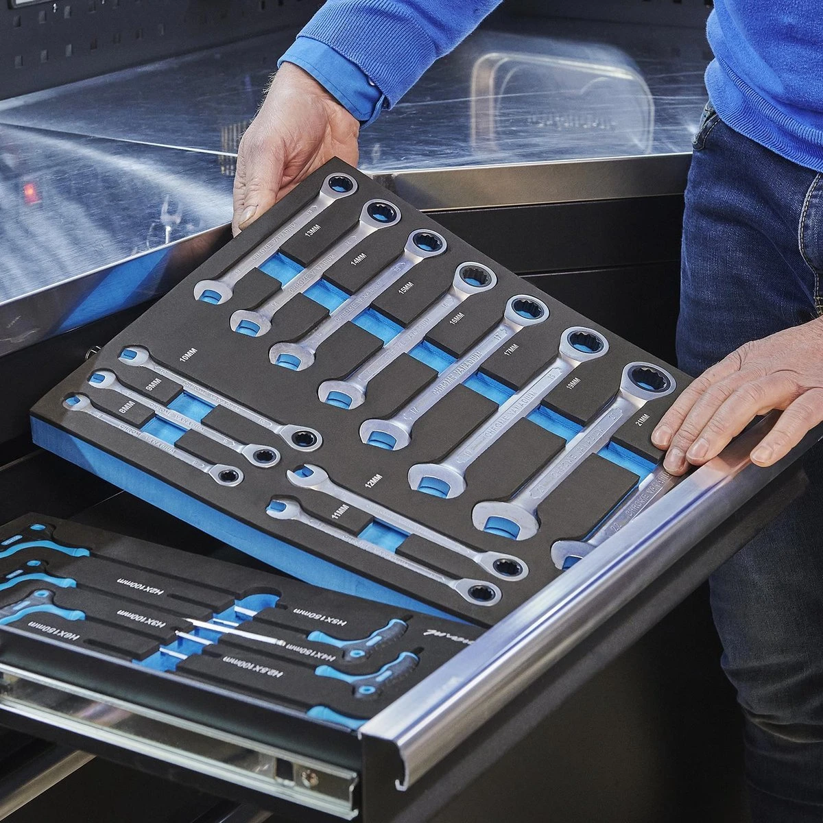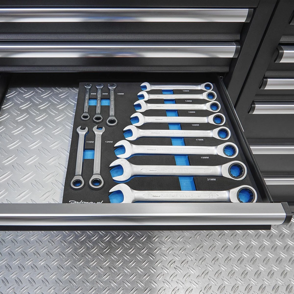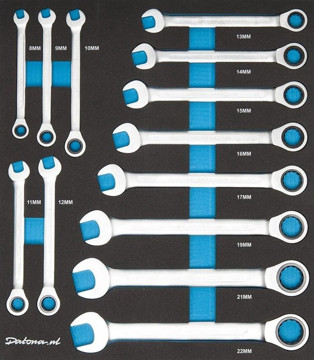 De gereedschapsets zijn geschikt voor de gereedschapswagens van Datona. De gereedschapsmodule heeft een lengte van 38 x 34 cm. U maakt uw gereedschapsset compleet met deze 17-delige ringratelset.