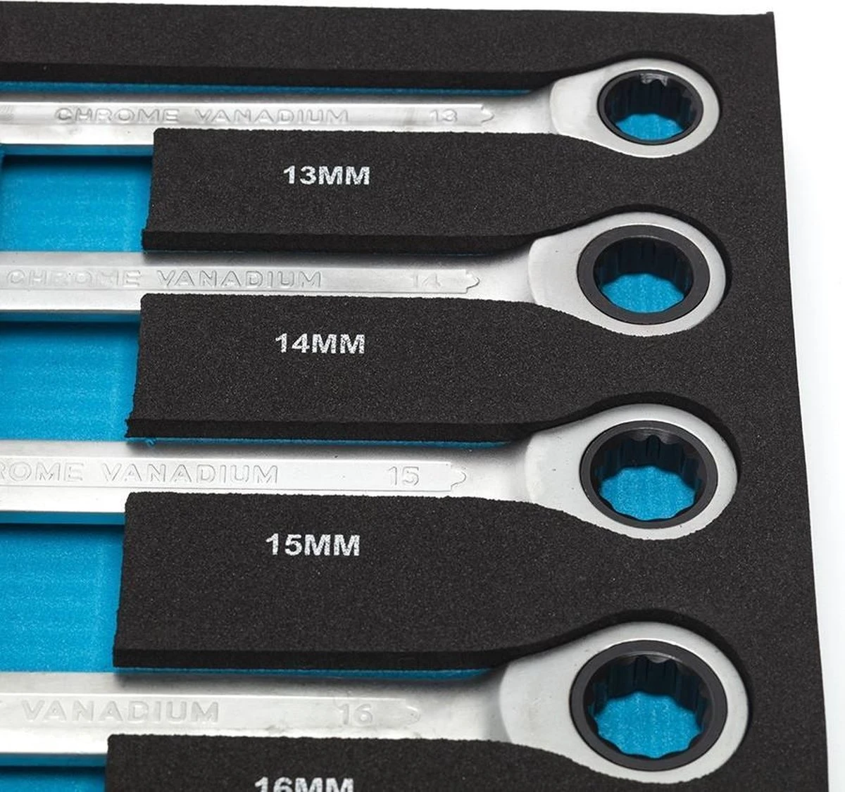 Met de 13-delige ringratelset bent u direct voorzien van alle veel gebruikte ringratelsleutels. De gereedschapsset is voorzien van 13 ringratel-steeksleutels en hebben een bereik van 8 mm t/m 22 mm. Hierdoor heeft u altijd de juiste gereedschap bij de hand. De ringratels zijn vervaardigd uit chroom vanadium en hebben een vast ratelmechanisme. Het ratelmechanisme is voorzien van een fijne vertanding van 72 kliks. Deze zeer fijne vertanding houdt in dat elke moer of bout eenvoudig is los- en vast te draaien. Een geheel rondje (360 graden) met deze sleutel is 72 klikken, dit houdt in dat u ook in kleine ruimtes nog kracht zet op een bout of moer. Op de ringratelsleutels staan de maten gedrukt in de sleutel, hierdoor weet u precies welke sleutel u nodig bent.