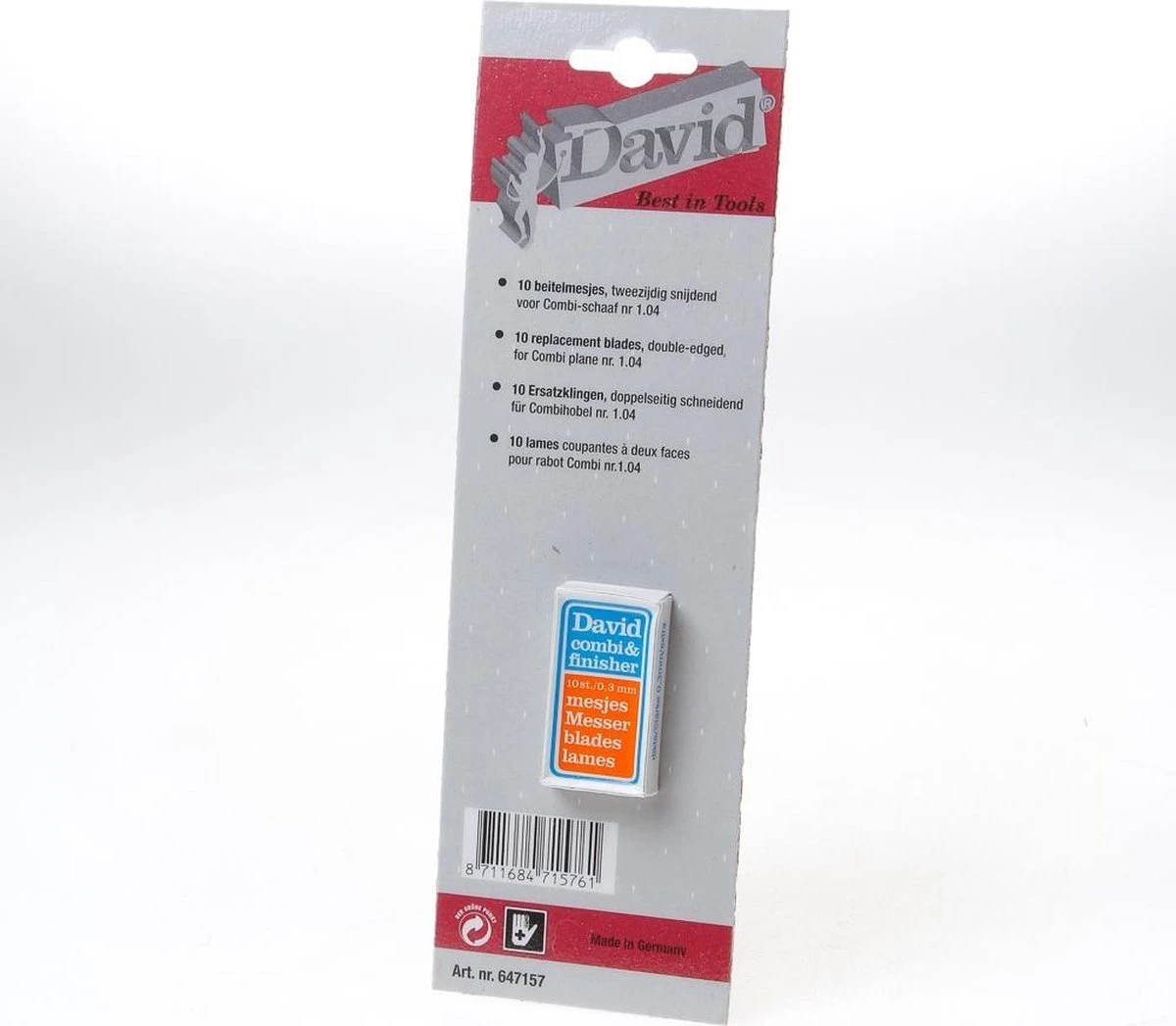 Metaal, 45mm breed, 0,3 dik, zeer scherp reservemesje, twee zijdig te gebruiken, in doosje van 10 stuks op kaart.