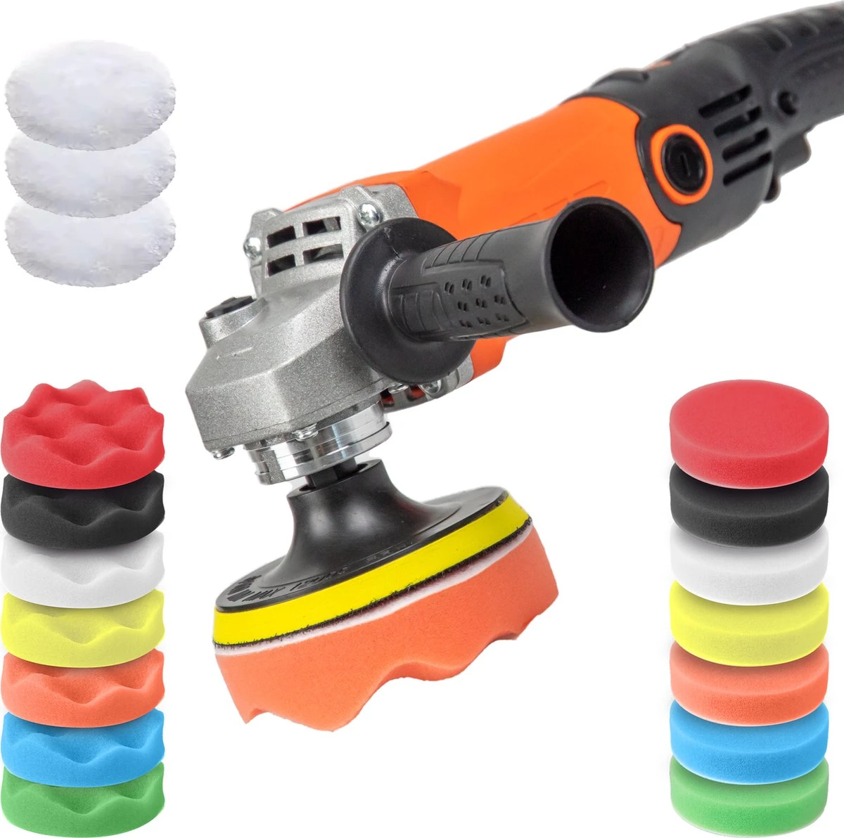 De Dekko Tools Polijsmachine is een complete set waarbij je heel veel verschillende polijstschijven meegeleverd krijgt. Hierdoor heb je de keuze uit 7 schijven voor een ruwe poetsvlak, 7 schijven voor een gladde oppervlak en 3 wolle schijven voor een stralend eindresultaat!!
