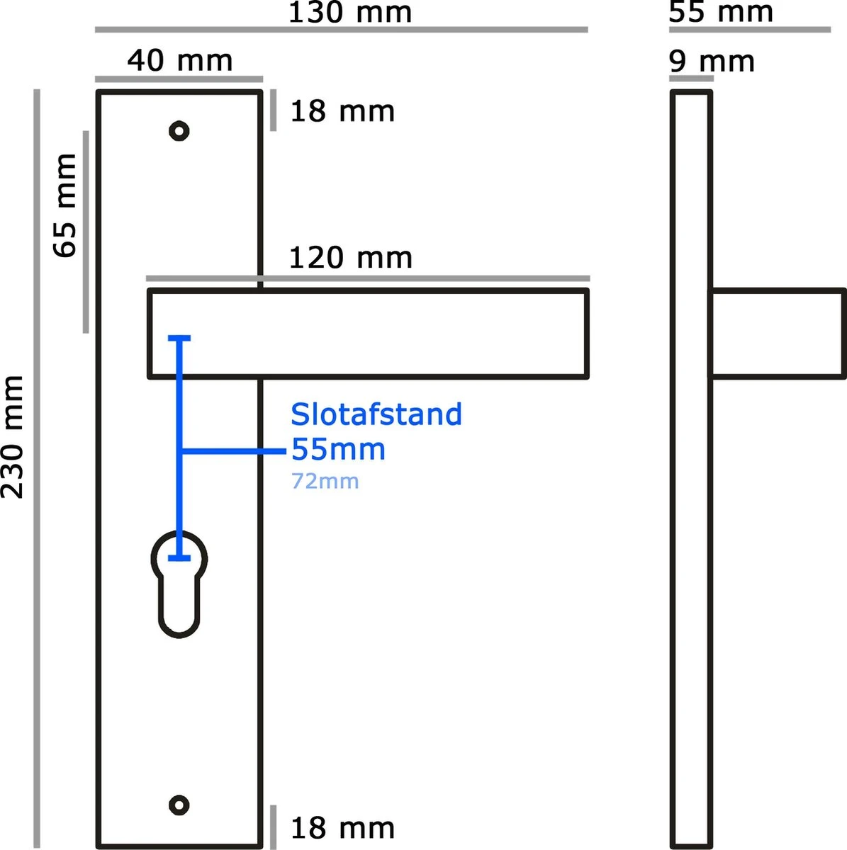 BELANGRIJK VOOR JE BESTELT (2) – Deze deurklink met profielcilinder, heeft een slotafstand (PC maat) van 55mm. Het is echter ook mogelijk dat jouw slot een slotafstand van 72mm heeft. Meet dus de slotafstand van je slot eerst goed op voor je bestelt. De slotafstand is de afstand van het hart van het krukgat tot hart van het slot. Zie afbeelding voor meer informatie over het juist opmeten.