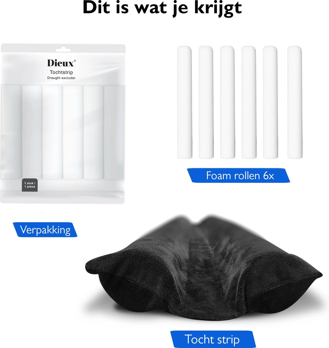 Inhoud verpakking: 1x Dieux tochtstriphoes, 6x foam rollen en 4x stickers