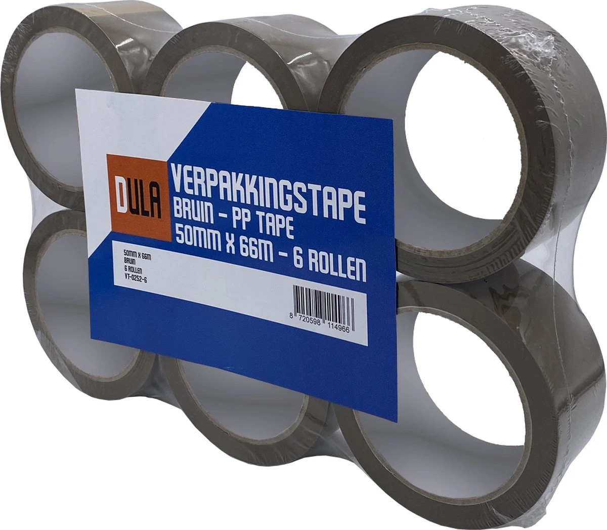 DULA bruine verpakkingstape voor het dicht tapen van al uw dozen groot of klein. De verpakkingstape is van uitstekende kwaliteit en hecht aan diverse ondergronden. De tape veroudert niet snel en kan hierdoor makkelijk een langere tijd opgeslagen worden. De populaire verpakkingstape is bruin en dus ideaal om dozen netjes mee te verpakken. Het is een stevig klevende polypropyleentape met acryl belijming. De DULA tape is een must voor ieder bedrijf, huis of evenement. De tape is 66 meter lang en 50mm breed.