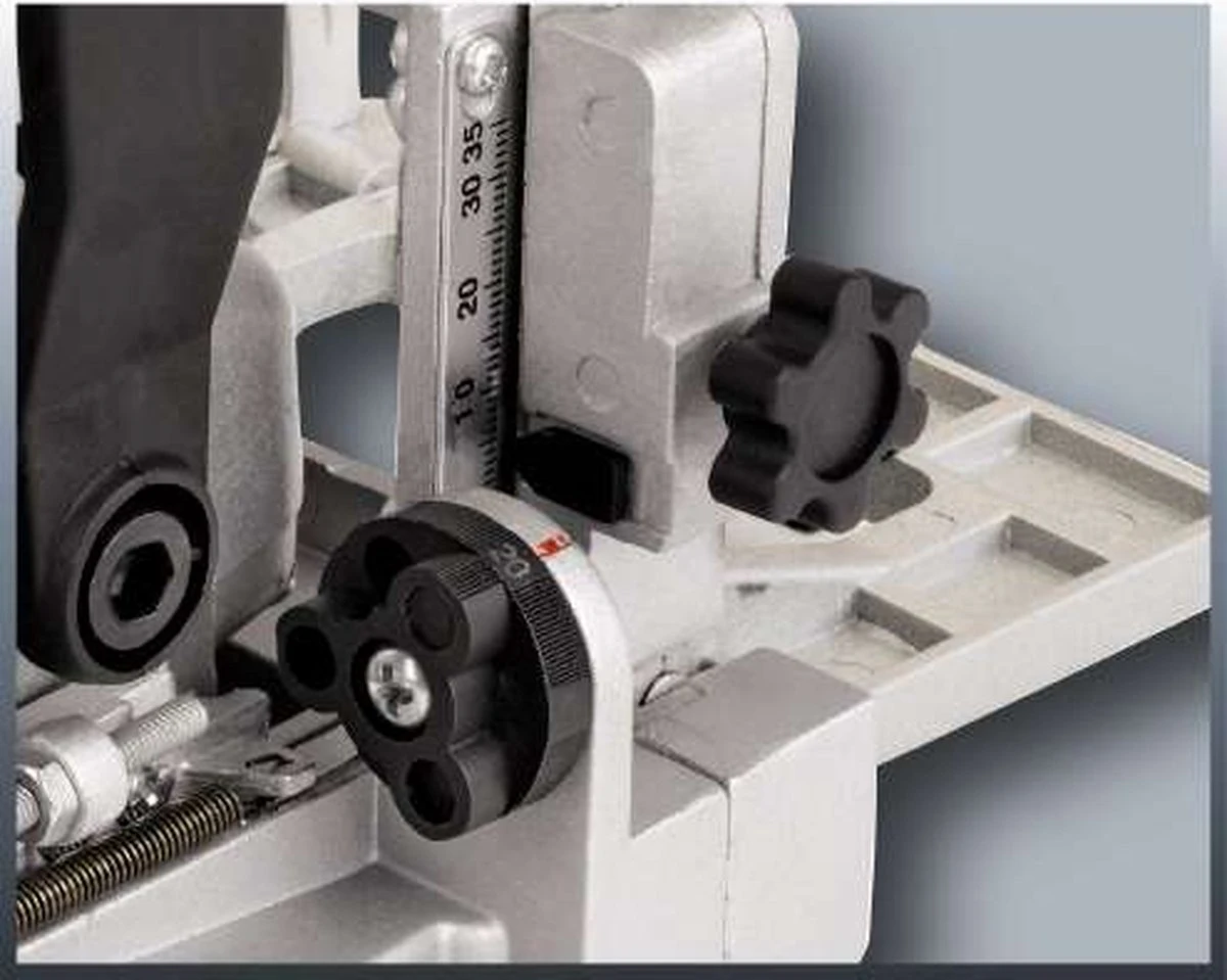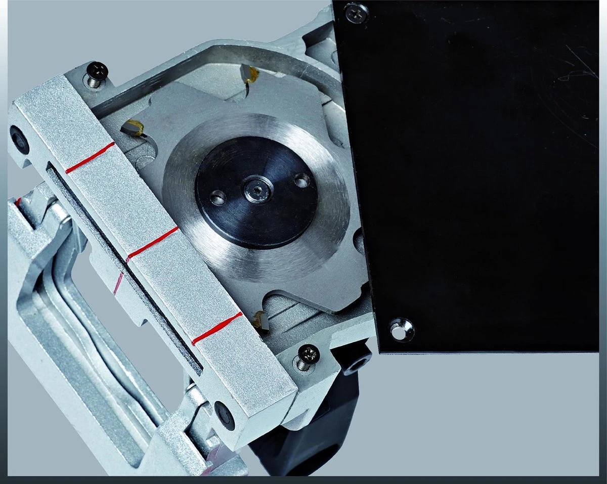 De Einhell Lamellendeuvelfrees TC-BJ 900 is een krachtige machine, die je helpt bij het frezen van sleuven en verbindingen in compact hout, multiplex, spaanplaat en soortgelijke materialen. De frees zorgt voor nauwkeurige en sterke verbindingen tussen materialen, waarbij je vooraf de freesdiepte kunt bepalen. Je hebt hierbij de keuze uit drie verschillende standen tot maximaal 14 mm, waartussen je eenvoudig kunt schakelen tijdens het uitvoeren van verschillende werkzaamheden. De machine is gemaakt uit aluminium van een hoogwaardige kwaliteit en beschikt over een krachtige motor met een vermogen van 860 W. Dit maakt het mogelijk om zelfs de meest ingewikkelde klussen met deze lamellendeuvelfrees uit te voeren. De motor is omgeven door een robuuste kunststof behuizing, voor een optimale veiligheid tijdens het uitvoeren van werkzaamheden. Het freesblad is eenvoudig te verwisselen met de spindelvergrendeling op de machine.