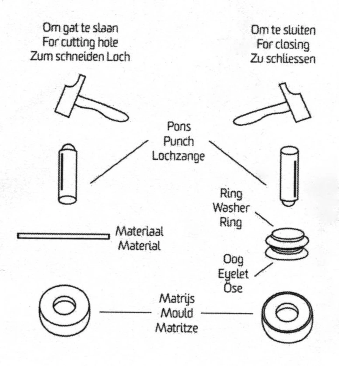 | Verpakkingsinhoud | 25 messing vernikkelde zeilringen met stempel voor het slaan van gat en ring. Roestvrije zeilringen |