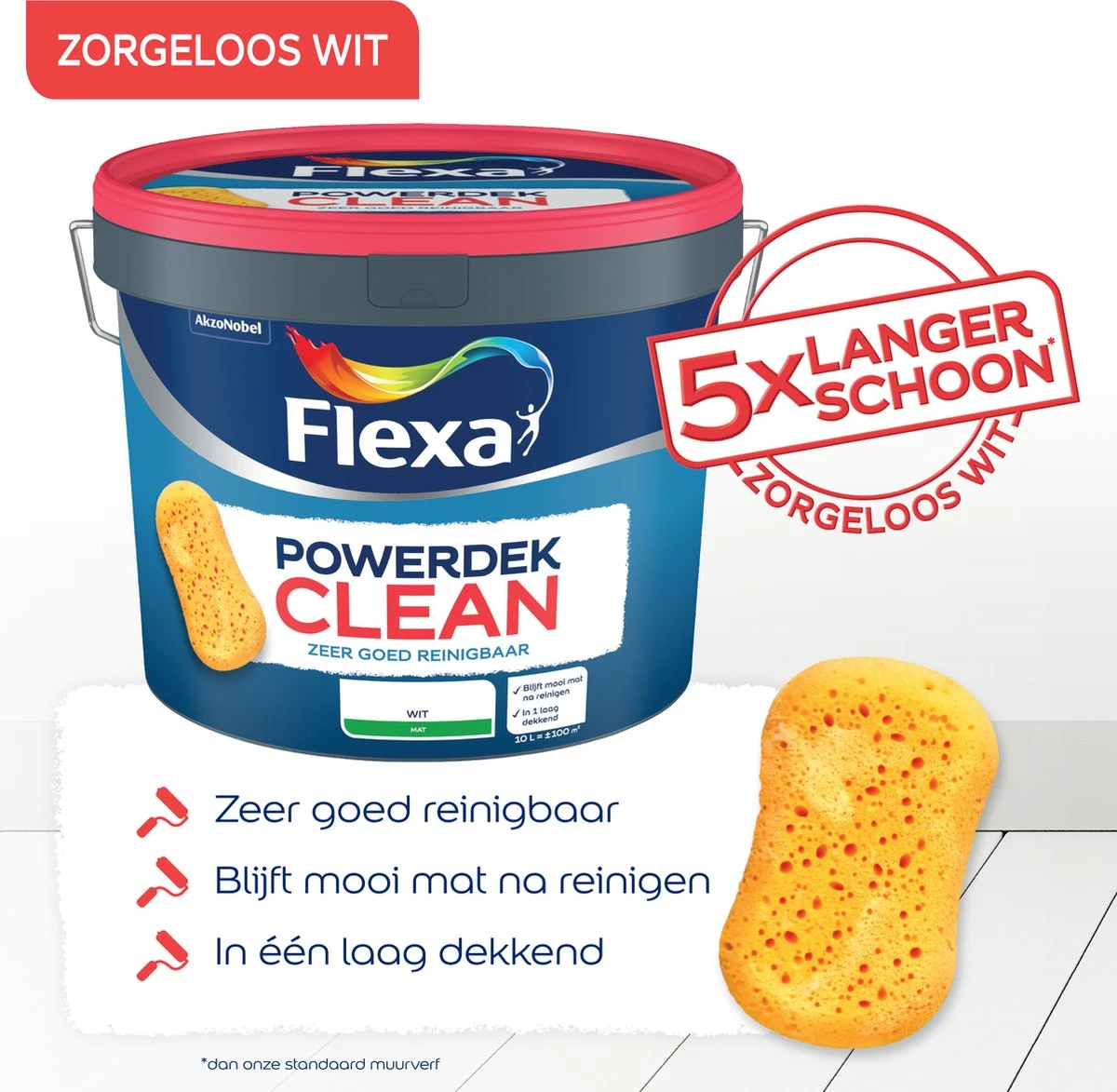 Flexa Powerdek Clean is een matte reinigbare muurverf voor binnen die zijn kleur behoudt. Bovendien is de muurverf makkelijk te verwerken en geurarm. De muurverf is geschikt voor muren en plafonds binnenshuis en is toepasbaar op baksteen, papierbehang, hard- en zachtboard, gipskarton, latex muurverf, schoon metselwerk en (glad) pleisterwerk. Beschikbaar in 10 L Wit en RAL 9010.