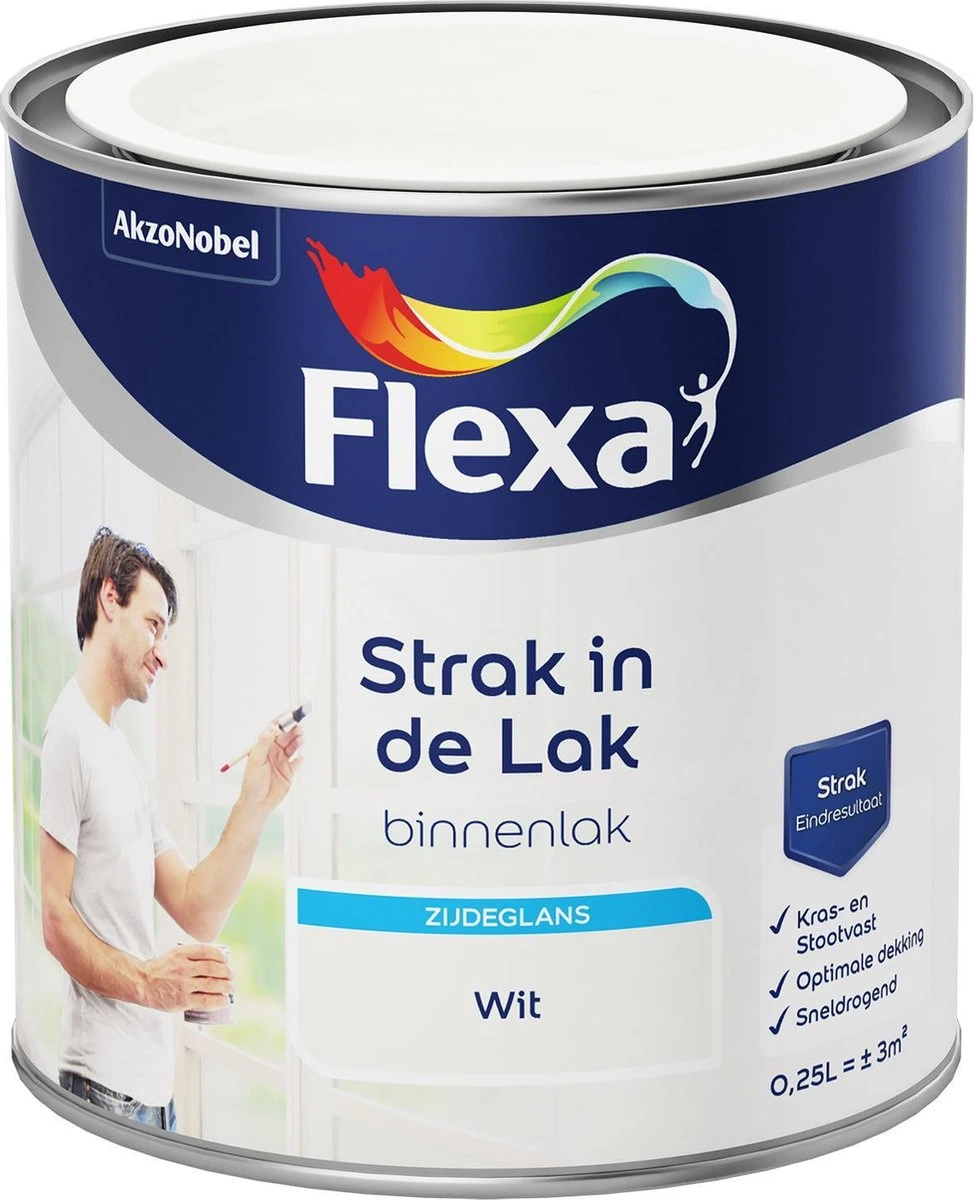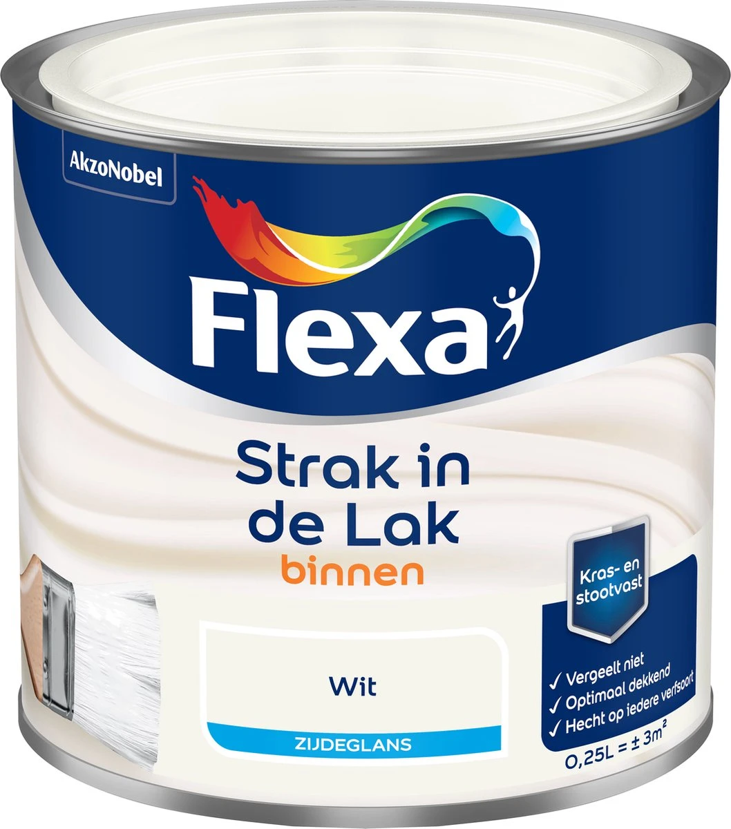 Flexa Strak in de Lak zijdeglans wit is ideaal om al je deuren, meubels, kozijnen en ander houtwerk in jouw gekozen kleur te schilderen! Deze verf op waterbasis geeft een goed dekkend, hoogwaardig en duurzaam resultaat. Deze witte lak op waterbasis is geschikt om te gebruiken op hout, metaal, kunststof en intacte verf. De lak is kras- en stootvast en dekt optimaal. Klaar je klus in een handomdraai, de lak droogt namelijk snel en geurarm. Anders dan lak op terpentinebasis, zal deze lak niet vergelen