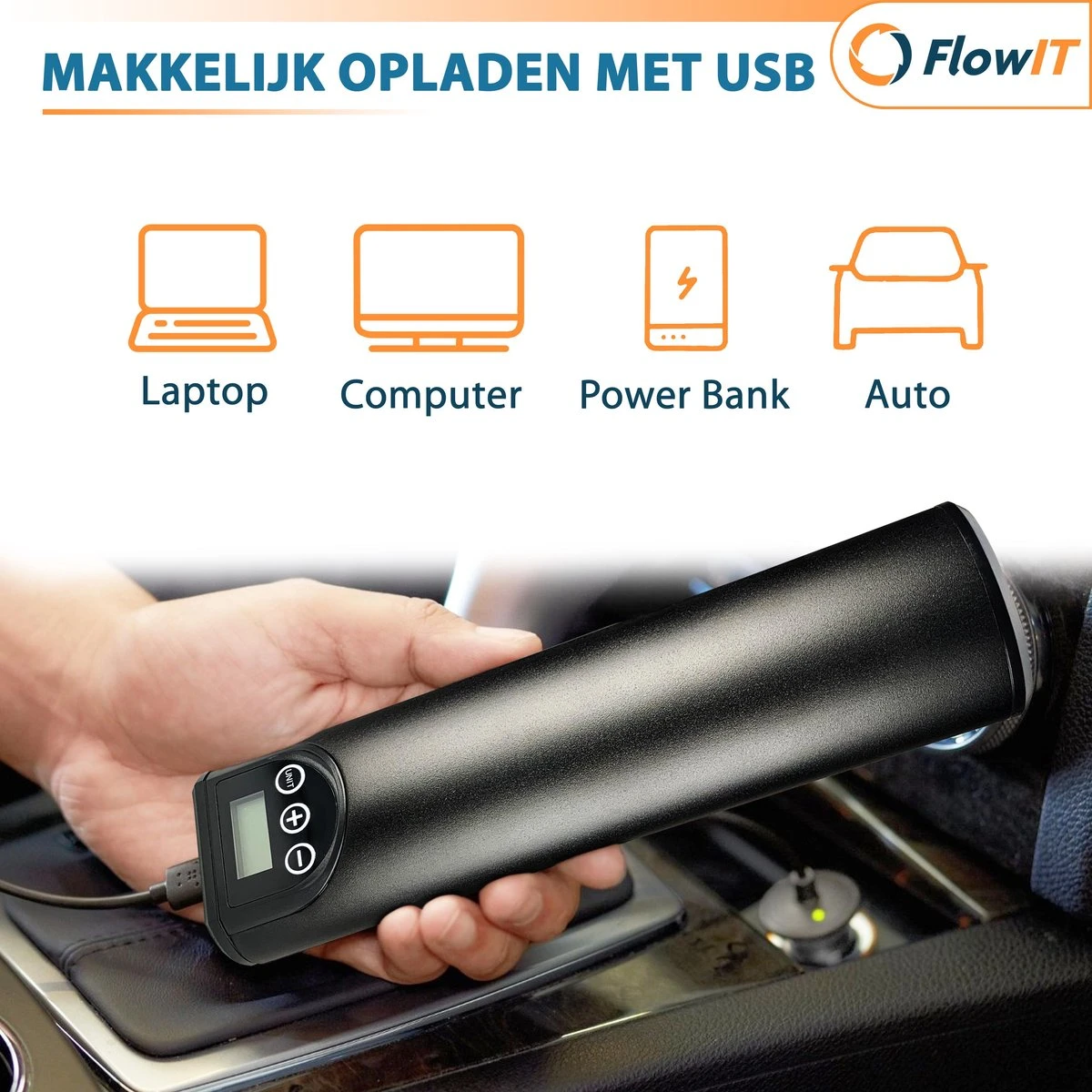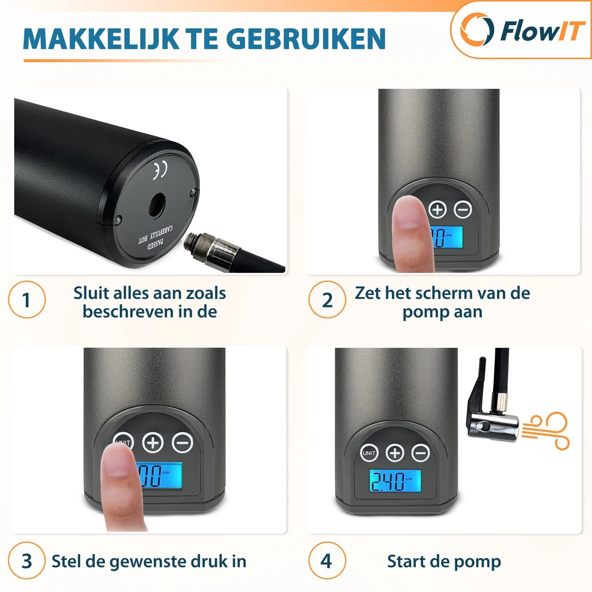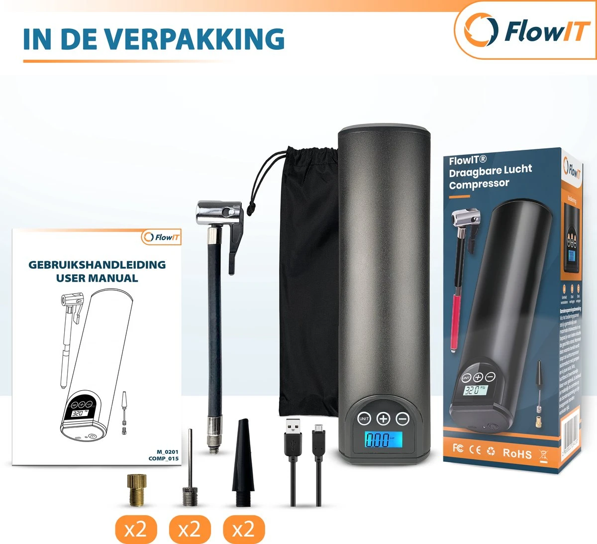 Met de FlowIT draagbare luchtcompressor pomp jij je banden binnen no-time op en ben jij altijd van hulp voorzien. Vanaf nu heb jij overal waar je gaat een luchtpomp op zak en wandel jij nooit meer naar huis met de fiets aan de hand!