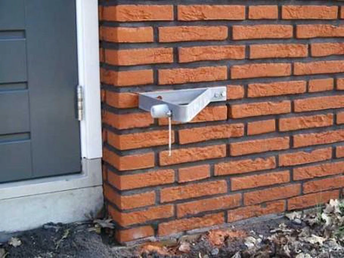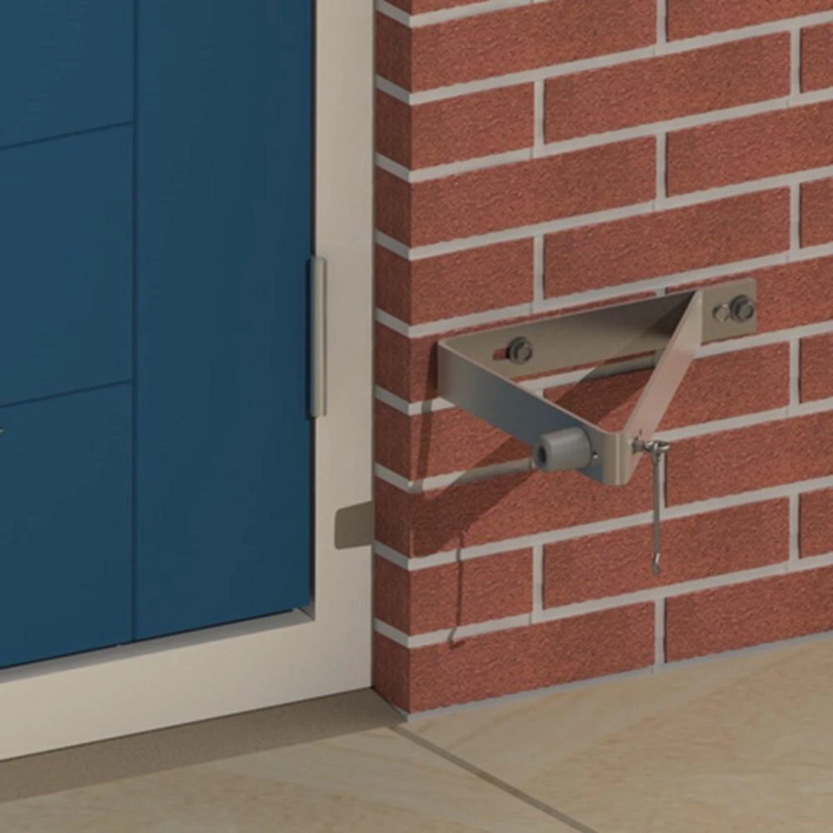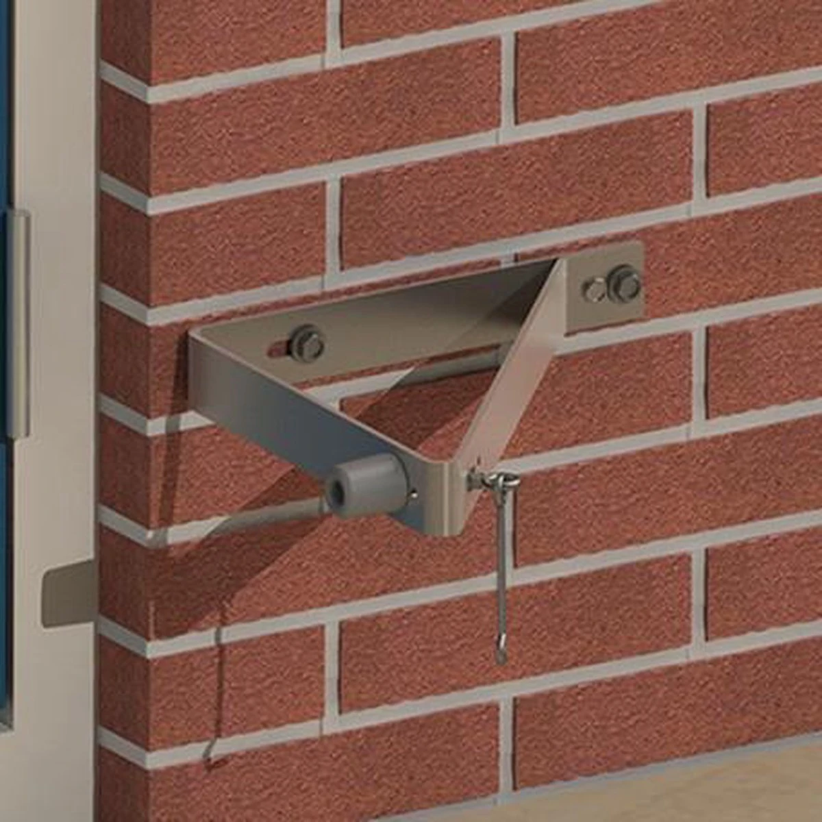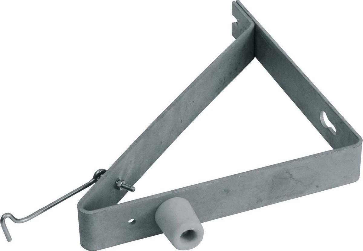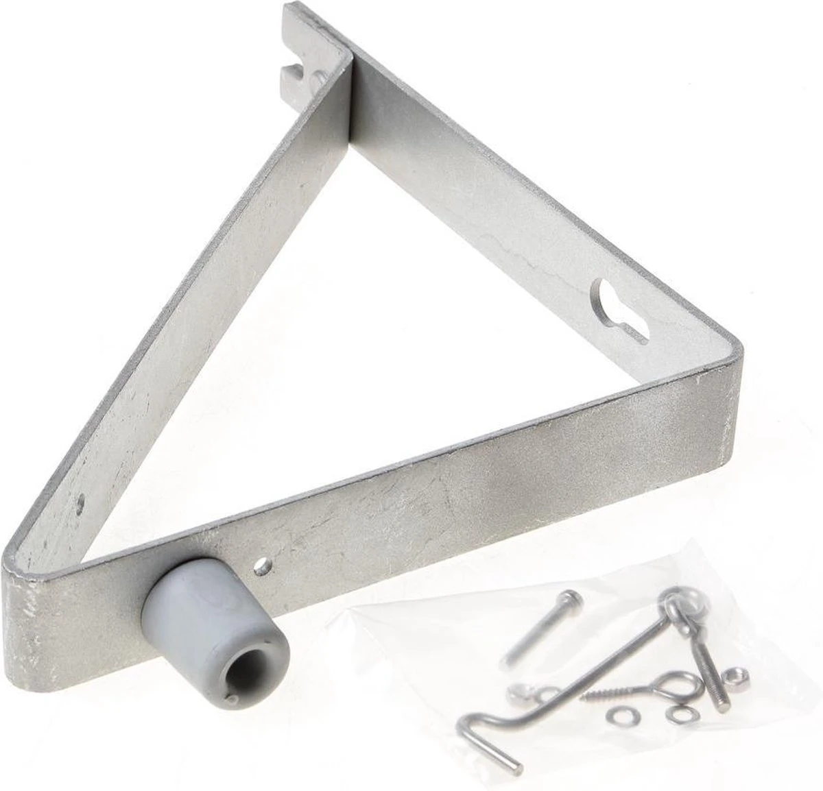 Deuropvangbeugel, driehoekig model, voor montage aan de buitenmuur om een naar buiten draaiende deur haaks op te vangen (inclusief deurbuffer en windhaak).