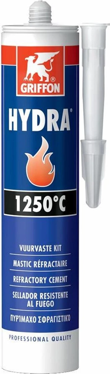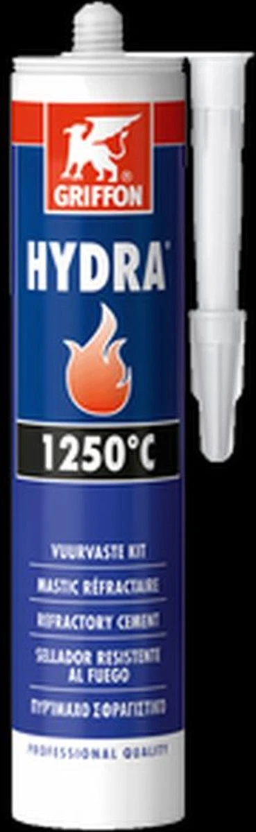 Hydra vuurvaste afdichtingskit voor het repareren en afdichten van scheuren, naden en voegen van openhaarden, allesbranders, kachels en schoorstenen. Temperatuurbestendig tot ca. 1250° Celsius. Door de met glasvezel versterkte kit verkrijgt men een stevige rookgasdichte kitlaag, die niet uitzet of krimpt. Droogt op als een harde massieve kitnaad. Niet geschikt voor cv-installaties en gasleidingen.