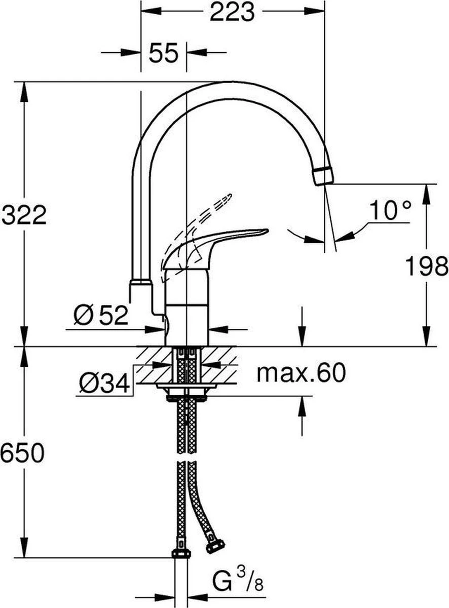 Let op! Dit is een hoge kraan (32,2cm). Je hebt voldoende ruimte tussen aanrechtblad en keukenkastjes nodig.
