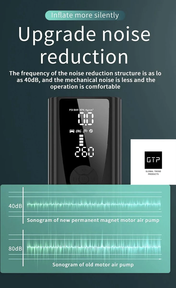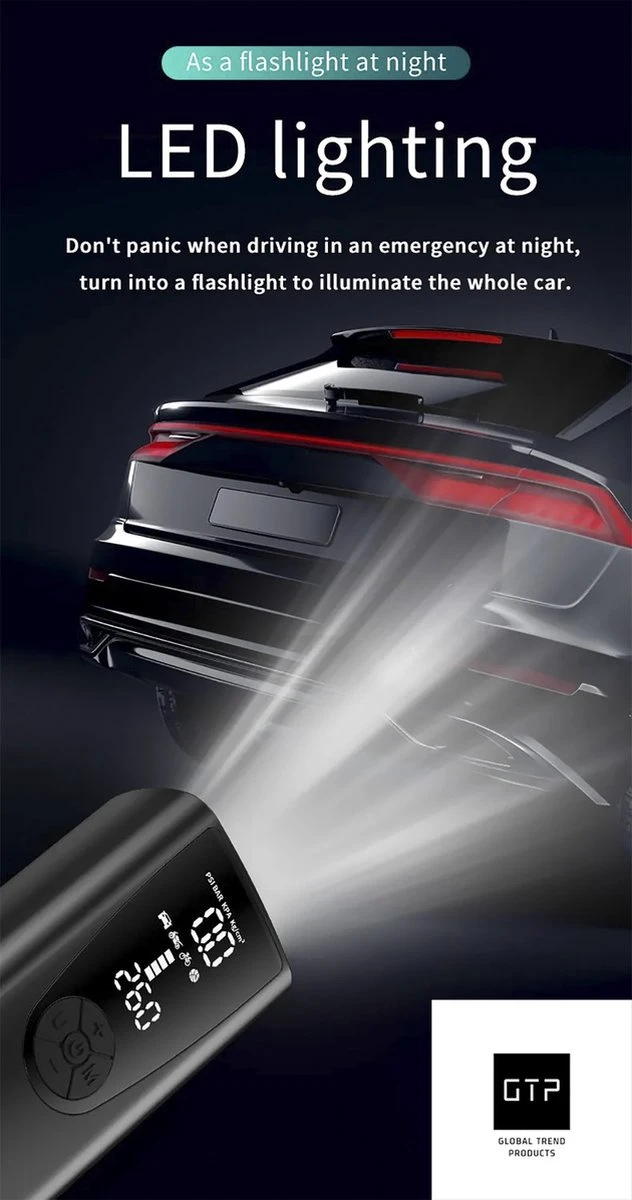 De GTP draagbare luchtcompressor is een van de beste multifunctionele luchtcompressors op de markt. De draagbare luchtcompressor zorgt ervoor dat je altijd de juiste bandenspanning hebt en is geschikt voor de fiets, motor, auto en ballen. De GTP luchtcompressor wordt met een dustbag geleverd, naast de functie van oppompen heeft het ook de functies om als powerbank, zaklamp en bandenspanningsmeter gebruikt te worden.