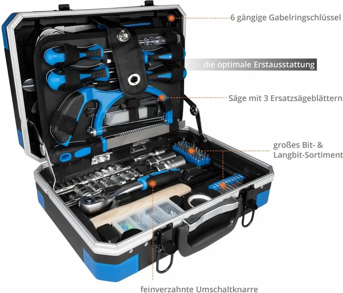 Een handige gereedschapskoffer die de perfecte basis- of eerste uitrusting bevat. Deze 241-delige gereedschapsset van chroom-vanadium- en koolstofstaal varieert van het klassieke schroevendraaierassortiment, een ratel met verschillende dopsleutels, meerdere tangen en combinatiesleutels tot een zaag en een groot bitassortiment inclusief lange bits. Waterpas, meterstok, hamer & co ontbreken natuurlijk ook niet. De koffer bevat ook een praktisch gesorteerde doos met verschillende bevestigingsmiddelen zoals spijkers en schroeven. Of het nu voor uw eigen huis is of als cadeau – deze alleskunner is de ideale keuze. Voor iedereen de perfecte basis- of instapuitrusting. 241-delige gereedschapsset van chroom-vanadium en koolstofstaal in handige koffer.